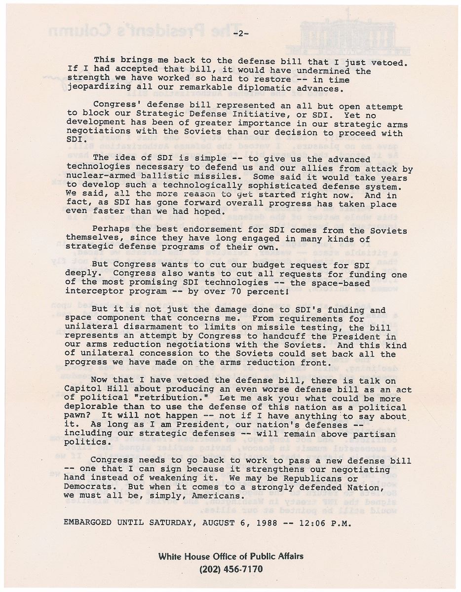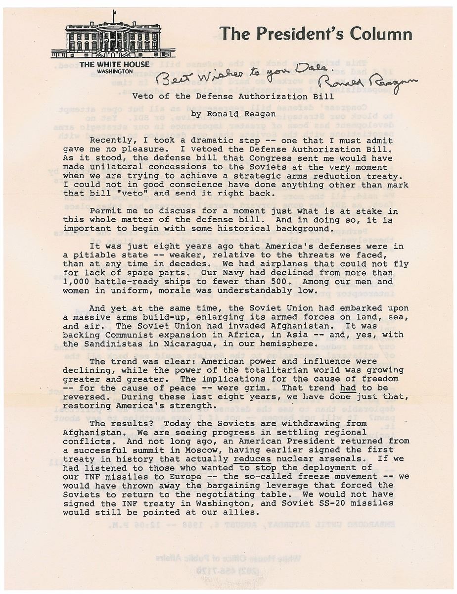 Souvenir typescript of Regan’s “Veto of the Defense Authorization Bill,” one page both sides, 8.5 x 11, originally issued on August 6, 1988, signed and inscribed at the top in black felt tip, “Best wishes to you Dale, Ronald Reagan.” In part: “Recently, I took a dramatic step—one that I must admit gave me no pleasure. I vetoed the Defense Authorization Bill. As it stood, the defense bill that Congress sent me would have made unilateral concessions to the Soviets at the very moment when we are trying to achieve a strategic arms reduction treaty. I could not in good conscience have done anything other than mark that bill ‘veto’ and send it right back.” In fine condition, with two horizontal folds and light toning.