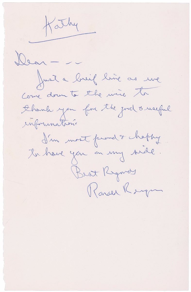 ALS, one page, 5.5 x 8.5, no date. Letter to Kathy, in full: “Just a brief line as we come down to the wire to thank you for the good & useful information. I’m most proud & happy to have you on my side.” In fine condition, with a rough left edge.