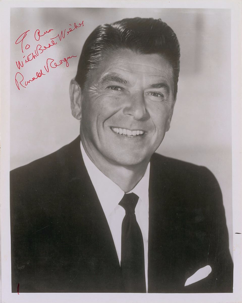 Dapper glossy 8 x 10 head-and-shoulders portrait of Reagan, signed and inscribed in red ink, “To Ann, with Best Wishes, Ronald Reagan.” In fine condition, with a small crease to his neckline, a stray red ink mark to lower left corner, and trivial soiling.