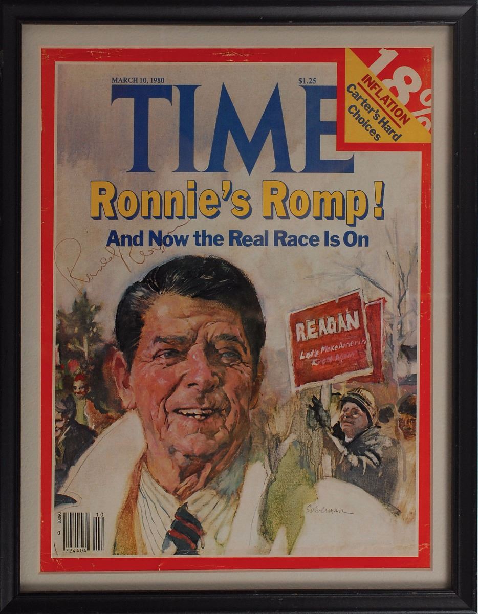 Time magazine cover from March 10, 1980, featuring an artist’s depiction of Reagan with a man holding a sign reading, “Reagan, Let’s make America great again,” 8 x 10.5, signed in black ballpoint. Matted and framed to an overall size of 9.75 x 12.5. In fine condition, with light creasing to edges and the signature a shade light.