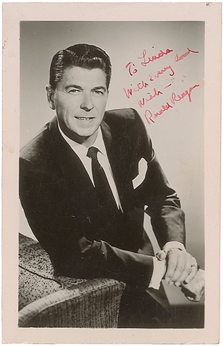 Vintage glossy 3.5 x 5.5 photo of a young Reagan in a handsome suit and tie, signed and inscribed in red fountain pen, “To Linda, With Every Good Wish—Ronald Reagan.” In fine condition, with trivial soiling, surface impressions, and edgewear, and adhesive remnants to reverse.