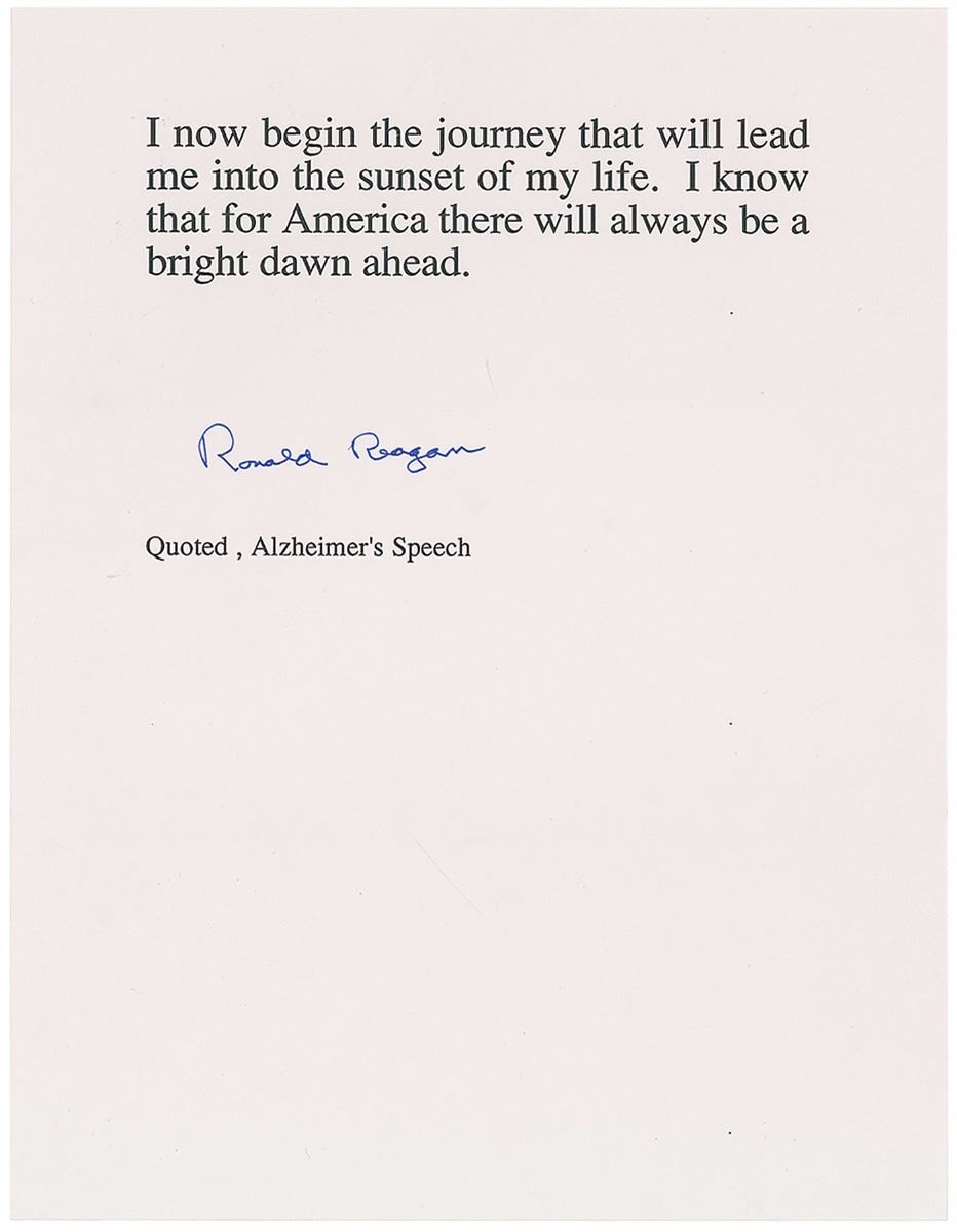 TQS on a white 8.5 x 11 sheet, signed at the bottom in blue ink. In full, “I now begin the journey that will lead me into the sunset of my life. I know that for America there will always be a bright dawn ahead.” Quoted from Reagan’s speech regarding his diagnosis of Alzheimer’s Disease. In fine condition.