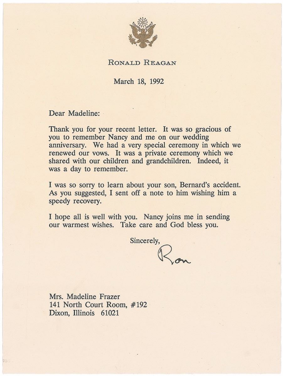 TLS signed “Ron,” one page, 6.25 x 8.5, personal letterhead, March 18, 1992. Letter to Madeline Frazer, the daughter of one of Reagan’s high school teachers, in part: “It was so gracious of you to remember Nancy and me on our wedding anniversary. We had a very special ceremony in which we renewed our vows. It was a private ceremony which we shared with our children and grandchildren. Indeed, it was a day to remember. I was so sorry to learn about your son, Bernard’s accident. As you suggested, I sent off a note to him wishing him a speedy recovery.” In fine condition.