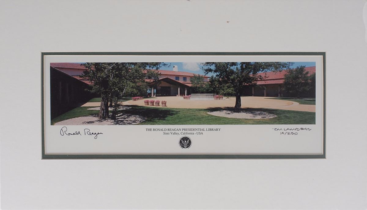 Limited edition color glossy 15 x 5.25 photo of the Ronald Reagan Presidential Library, numbered 14/250, signed in the lower left in black felt tip by Ronald Reagan, and in the lower right by the photographer, Tom Lamb. Double-matted to an overall size of 20 x 11.5. In very fine condition.