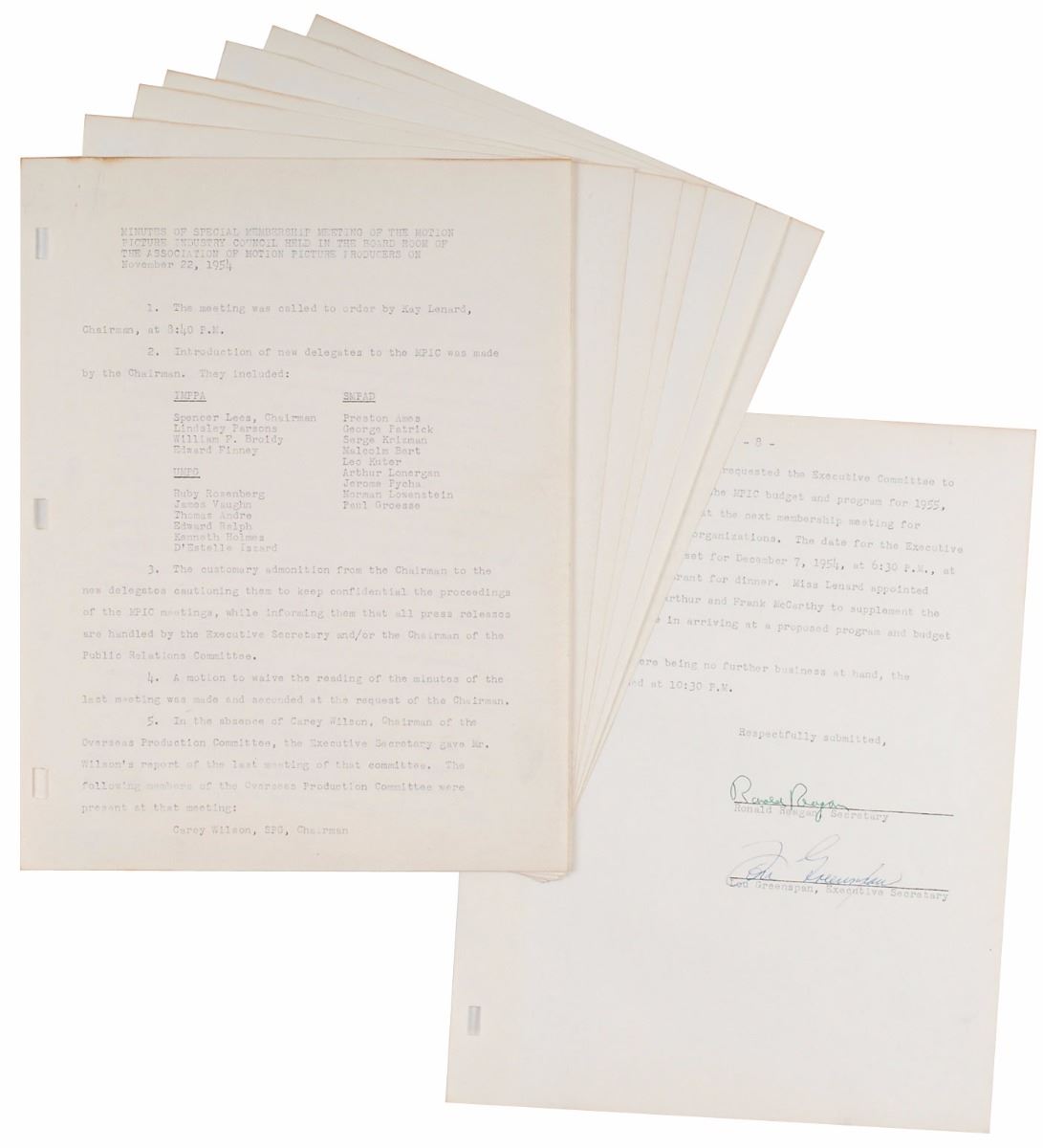 DS, eight pages, 8.5 x 1, November 22, 1954. Document headed “Minutes of Special Membership Meeting of the Motion Picture Industry Council,” mentioning Reagan several times. In part: “Ronald Reagan reviewed the past history of the MPIC, the grand job it had done and was still in a position to do providing it were adequately financed. He referred to the organization of the MPIC with: ‘This organization was formed in self-defense…Maybe one of the things we suffer from now is the spell of peace. To think of the organization going out of business because right now there isn’t enough support or interest…is like dismissing the army and navy because there is no war on.’” Signed at the conclusion in fountain pen by Ronald Reagan as secretary and countersigned by Lou Greenspan as executive secretary. In fine condition, with expected document wear. A wonderful, early Reagan example that demonstrates both his charisma and leadership abilities.