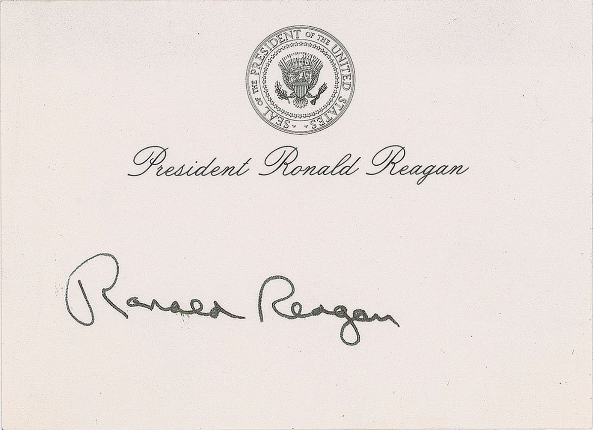 Ink signature, “Ronald Reagan,” on Reagan’s personal off-white 4 x 3 ‘Post-It’ sheet with printed presidential seal. In fine condition. Following his presidency, Reagan pre-signed these sheets and carried them around with him as a way of easily complying with requests for autographs.
