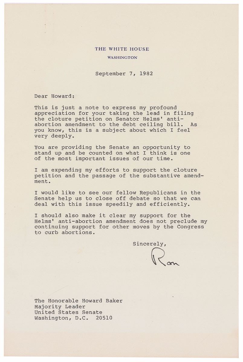 TLS as president signed “Ron,” one page, 7 x 10.5, White House letterhead, September 7, 1982. Letter to Senate Majority Leader Howard Baker. In full: “This is just a note to express my profound appreciation for your taking the lead in filing the cloture petition on Senator Helms' anti-abortion amendment to the debt ceiling bill. As you know, this is a subject about which I feel very deeply. You are providing the Senate an opportunity to stand up and be counted on what I think is one of the most important issues of our time. I am expending my efforts to support the cloture petition and the passage of the substantive amendment. I would like to see our fellow Republicans in the Senate help us to close off debate so that we can deal with this issue speedily and efficiently. I should also make it clear my support for the Helms anti-abortion amendment does not preclude my continuing support for other moves by the Congress to curb abortions.” In fine condition. Reagan’s administration was silent on the issue of abortion until 1982, when Jesse Helms introduced an amendment to a debt ceiling bill that would ban federal funding and encourage challenges against Roe v. Wade. The bill was filibustered and the result of the vote for cloture was unsuccessful, and the measure was not passed once it did come to a vote.