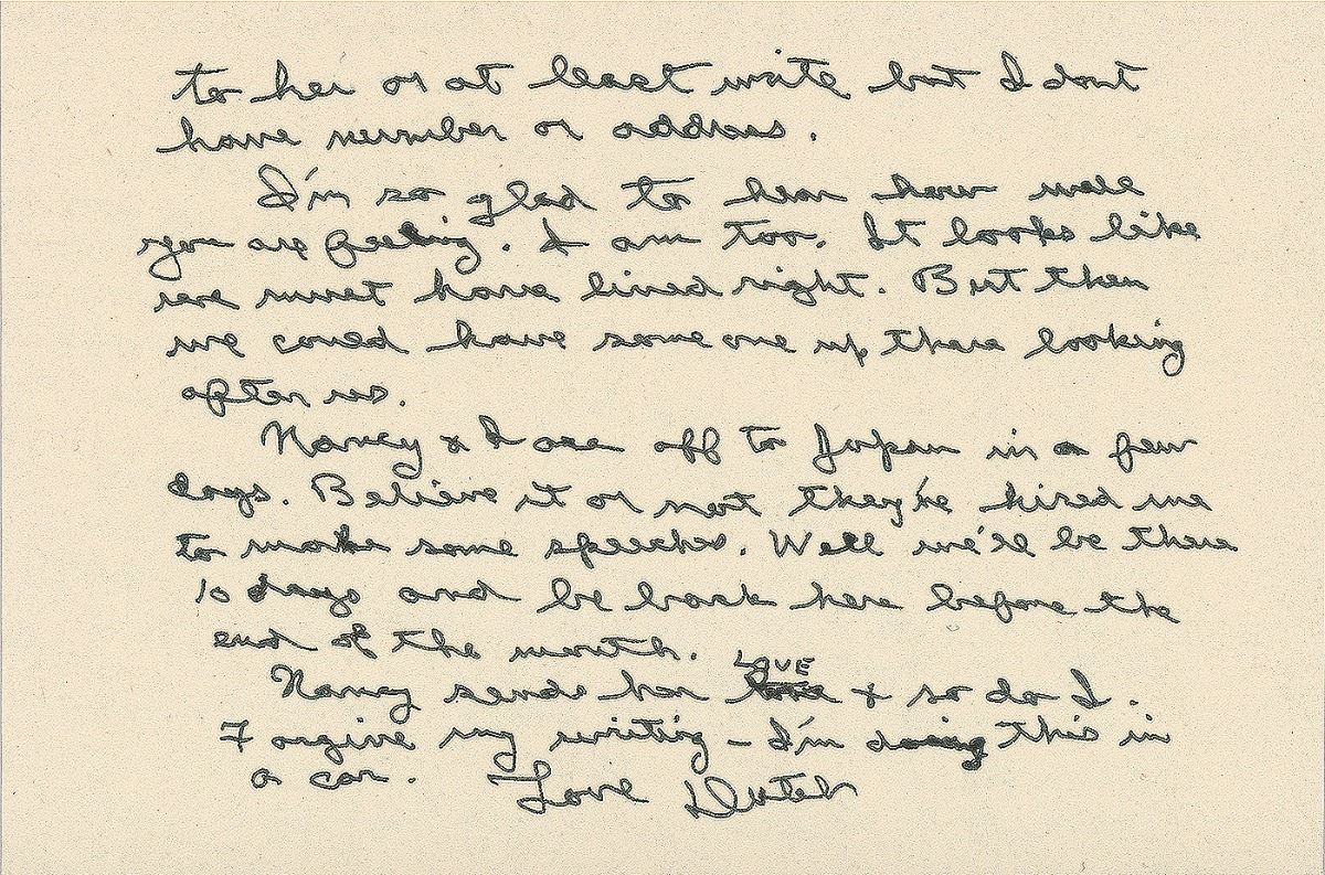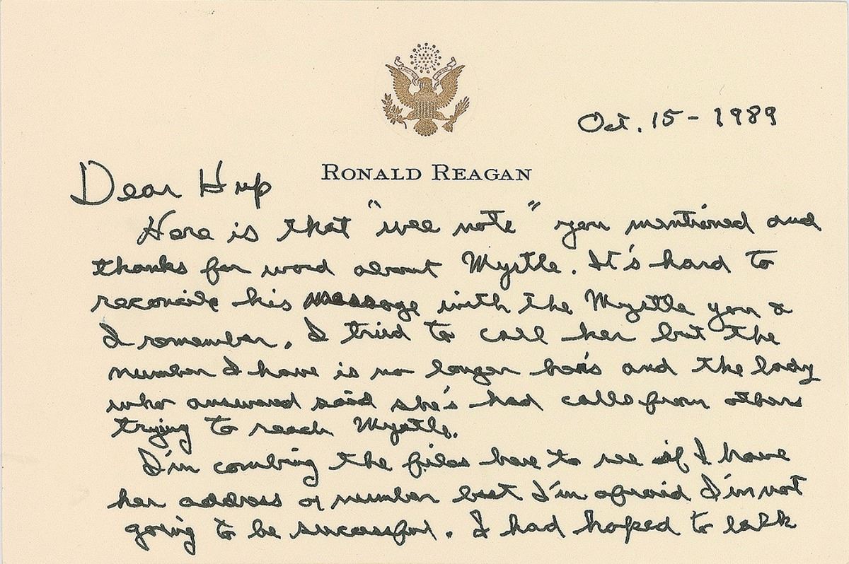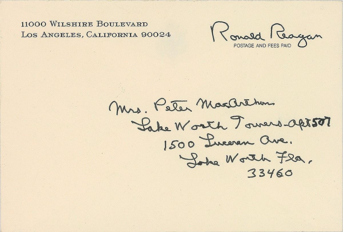 ALS signed “Dutch,” one page both sides, 6.25 x 4.25, personal letterhead, October 15, 1989. Letter to Lydia Hupfer “Hup” McArthur, in part: “Here is that ‘wee note’ you mentioned and thanks for word about Myrtle…I had hoped to talk to her or at least write but I don’t have number or address. I’m so glad to hear how well you are feeling. I am too. It looks like we must have lived right. But then we could have someone up there looking after us. Nancy and I are off to Japan in a few days. Believe it or not they’ve hired me to make some speeches. Well we’ll be there in 10 days and be back here before the end of the month.” In very fine condition. Accompanied by the original mailing envelope, written in Reagan’s hand and bearing a pre-printed free frank. Lydia Hupfer ‘Hup’ MacArthur was the widow of Pete MacArthur, program director of WOC in Davenport, Iowa. In 1932, MacArthur had given a then 21-year-old Reagan his first job as a sports announcer. They would remain friends until her passing at the age of 102 in 1995.