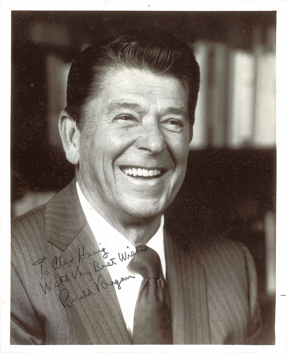 Excellent glossy 8 x 9.75 bust-length photo of a cheerful Reagan, signed and inscribed in black felt tip, “To Alex Henig, With Very best Wishes, Ronald Reagan.” In fine condition, with three tiny, unobtrusive tack holes to borders. A great image of the fortieth president.