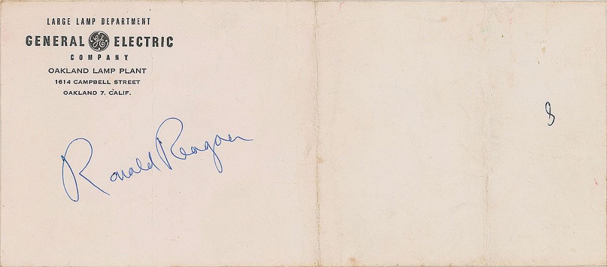 General Electric Large Lamp Department mailing envelope, 9.25 x 4, signed in blue ballpoint by Reagan. In very good to fine condition, with three vertical folds, and general handling wear.
