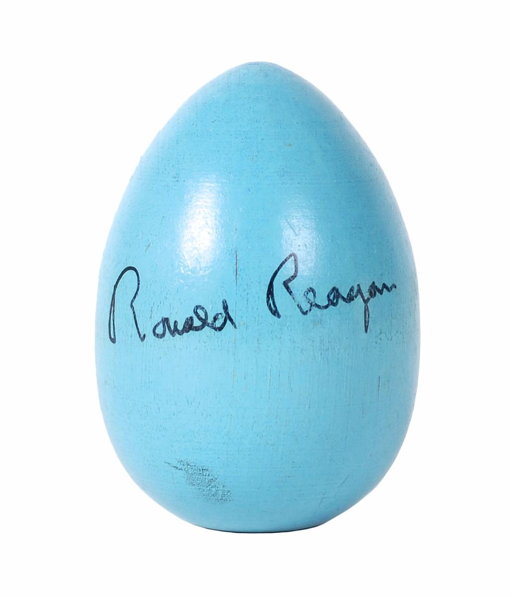 Uncommon blue wooden Easter egg, 2.5? tall, signed in black ink by Reagan. In fine condition.