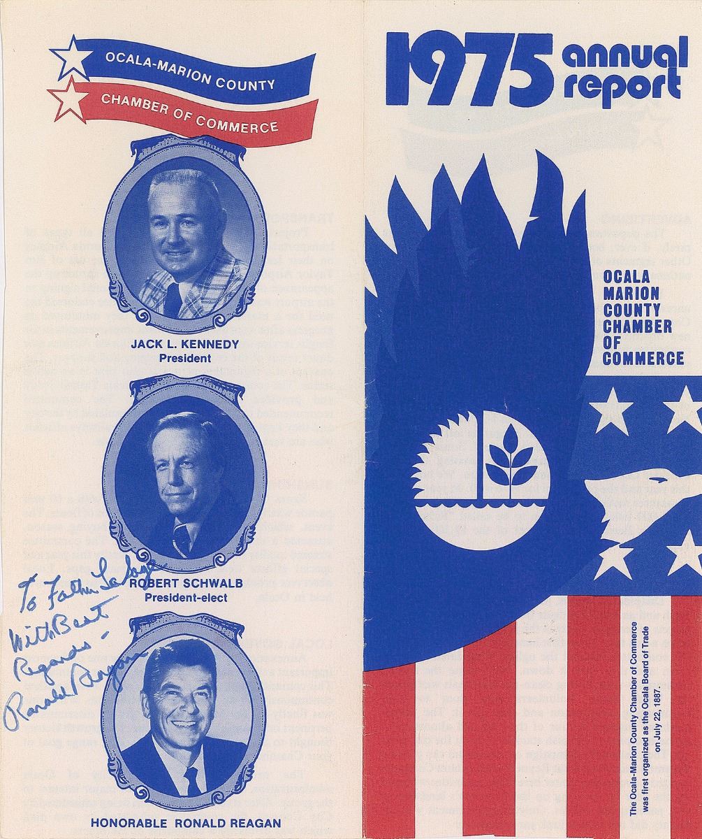 Pamphlet for the 1975 Annual Report of the Ocala Marion County Chamber of Commerce, measuring 7.5 x 9 open, signed and inscribed next to his image in black felt tip, “To Father La Sage, With Best Regards—Ronald Reagan.” In fine condition, with somewhat irregularly trimmed edges.