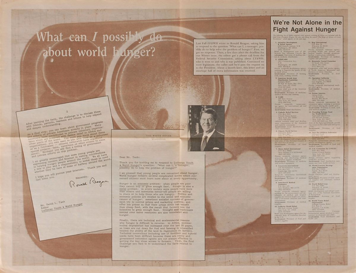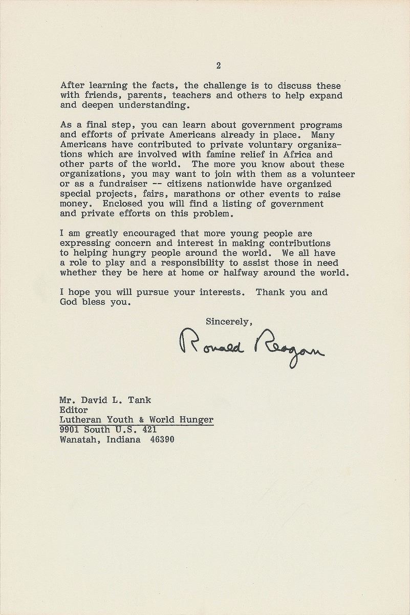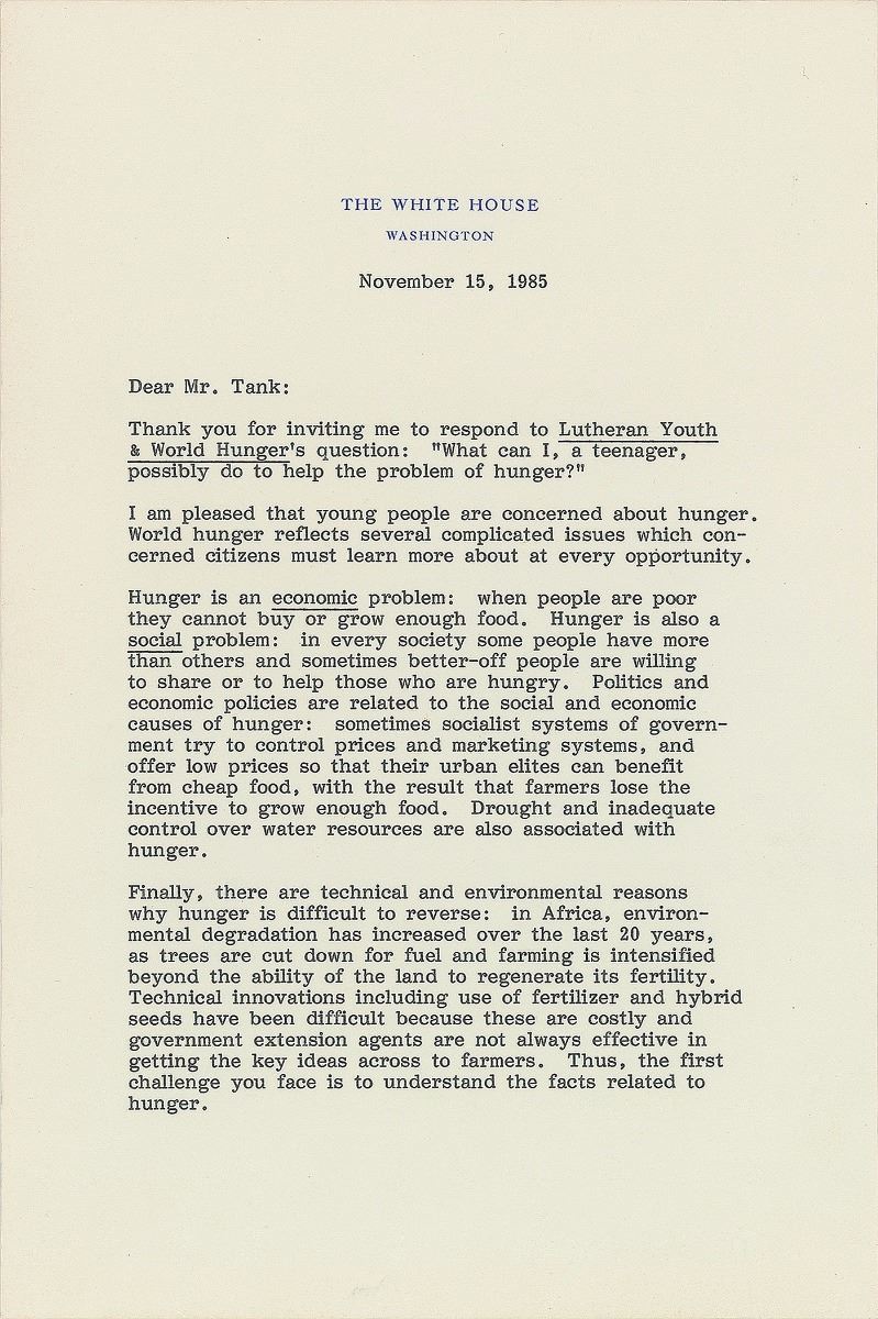 TLS as president, two pages, 7 x 10.5, White House letterhead, November 15, 1985. Letter to David L. Tank, in part: “I am pleased that young people are concerned about hunger. World hunger reflects several complicated issues which concerned citizens must learn more about at every opportunity. Hunger is an economic problem: when people are poor they cannot buy or grow enough food. Hunger is also a social problem: in every society some people have more than others and sometimes better-off people are willing to share or to help those who are hungry. Politics and economic policies are related to the social and economic causes of hunger: sometimes socialist systems of government try to control prices and marketing systems, and offer low prices so that their urban elites can benefit from cheap food, with the result that farmers lose the incentive to grow enough food. Drought and inadequate control over water resources are also associated with hunger…After learning the facts, the challenge is to discuss these with friends, parents, teachers and others to help expand and deepen understanding…I am greatly encouraged that more young people are expressing concern and interest in making contributions to helping hungry people around the world. We all have a role to play and a responsibility to assist those in need whether they be here at home or halfway around the world.” In very fine condition. Accompanied by the original mailing envelope and additional documentation related to Lutheran Youth & World Hunger, including a newsletter which illustrates this letter.
