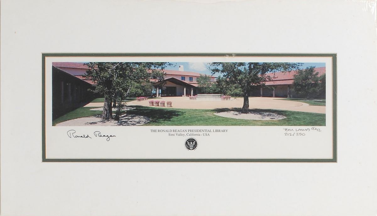 Limited edition color glossy 15 x 5.25 photo of the Ronald Reagan Presidential Library, numbered 212/250, signed in the lower left in black felt tip by Ronald Reagan, and in the lower right by the photographer, Tom Lamb. Double-matted to an overall size of 20 x 11.5. In very fine condition.