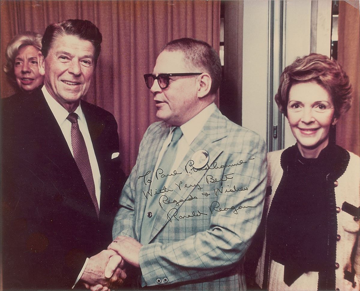 Color semi-glossy 9.75 x 8 photo of Ronald and Nancy Reagan posing with a gentleman, signed and inscribed in black ink, “To Paul Prudhomme—With very best regards & wishes, Ronald Reagan.” In fine condition.