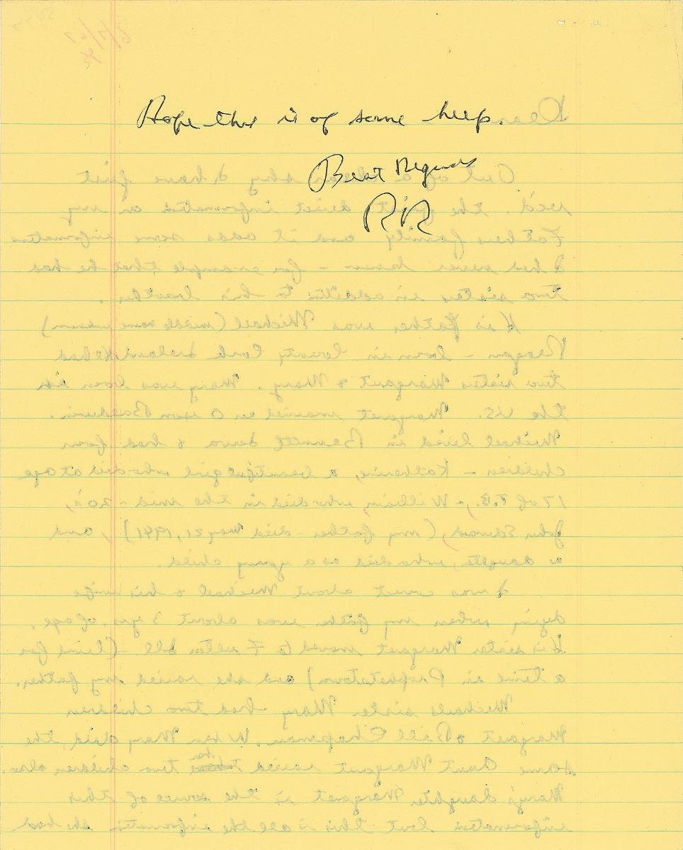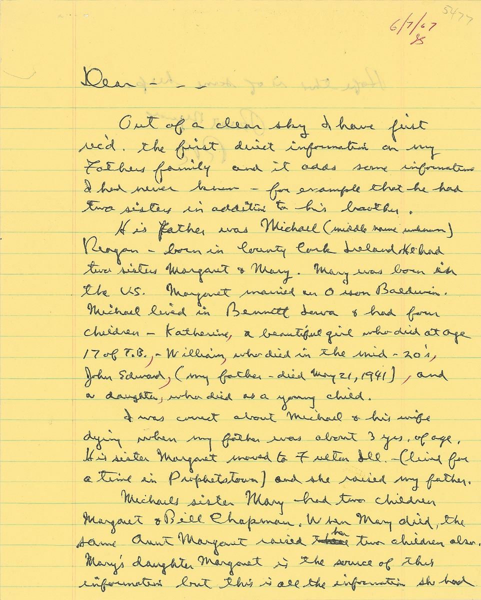 ALS signed “RR,” one page, lightly-lined both sides, 8 x 10, dated in another hand June 7, 1967. In part: “Out of a clear sky I have first rec’d the first direct information on my father’s family and it adds some information I had never known—for example that he had two sisters in addition to his brother. His father was Michael (middle name unknown) Reagan—born in County Cork Ireland. He had two sisters Margaret & Mary. Mary was born in the US…Michael lived in Bennett Iowa & had four children—…I was correct about Michael & his wife dying when my father was about 3 yrs. of age. His sister Margaret moved to Fulton, Ill. (lived for a time in Prophetstown) and she raised my father. Michael’s sister Mary had two children, Margaret & Bill Chapman. When Mary died, the same Aunt Margaret raised her two children also. Mary’s daughter Margaret is the source of this information but this is all the information she had. Hope this is of some help.” In fine condition.