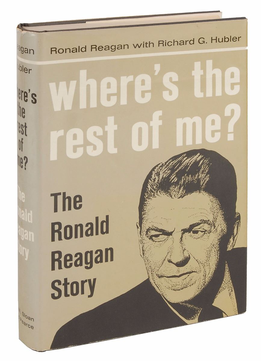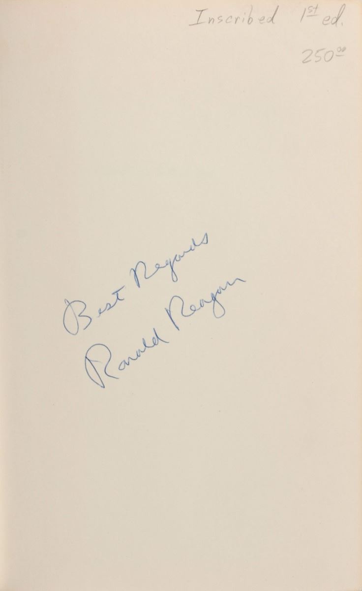 Signed book: Where’s the Rest of Me? First edition. NY: Duell, Sloan and Pearce, 1965. Hardcover with dust jacket, 5.75 x 8.25, 316 pages. Signed on the first free end page in blue ballpoint, “Best Regards, Ronald Reagan.” In fine condition.