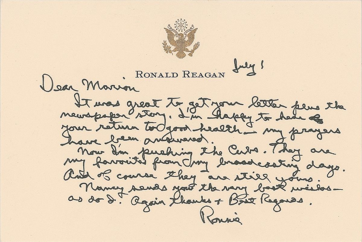 ALS signed “Ronnie,” one page, 6.25 x 4.25, embossed personal letterhead, no date. Letter to Marion Grimm, in full: “It was great to get your letter plus the newspaper story. I’m happy to hear your return to good health—my prayers have been answered. Now I’m pushing the Cubs. They are my favorite from my broadcasting days. And of course they are still yours. Nancy sends you the very best wishes—as do I.” In very fine condition. Accompanied by the original mailing envelope, addressed in Reagan’s own hand and bearing a preprinted free frank. Marion Grimm was the wife of former professional baseball player Charlie Grimm, who played first base for the Chicago Cubs for several seasons.
