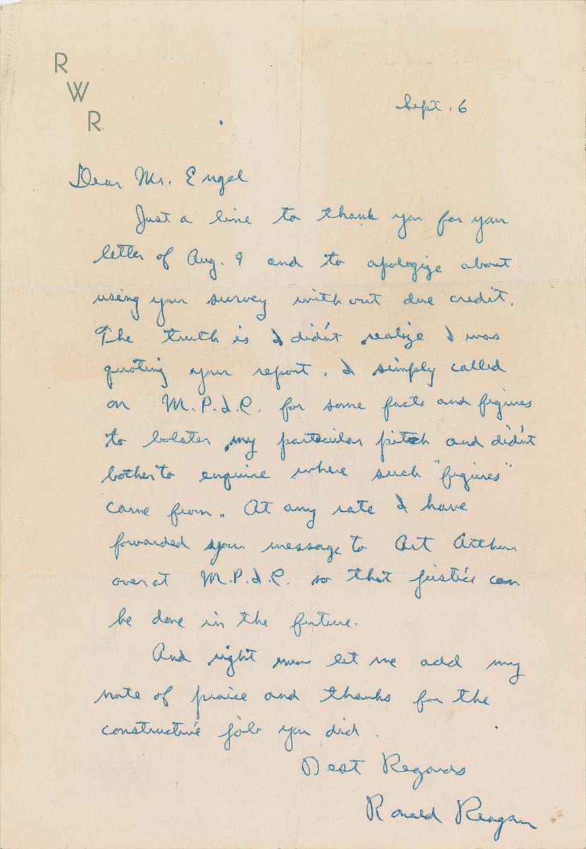 ALS, one page, 7.25 x 10.5, personal letterhead, September 6. Letter to Mr. Engel, in part: “Just a line to thank you for your letter of Aug. 9 and to apologize about using your survey without due credit. The truth is I didn’t realize I was quoting your report. I simply called on MPIC for some facts and figures to bolster my particular pitch and didn’t bother to enquire where such ‘figures’ came from. At any rate I have forwarded your message to Art Arthur over at MPIC so that justice can be done in the future.” In very good to fine condition, with light overall wrinkling and creasing.