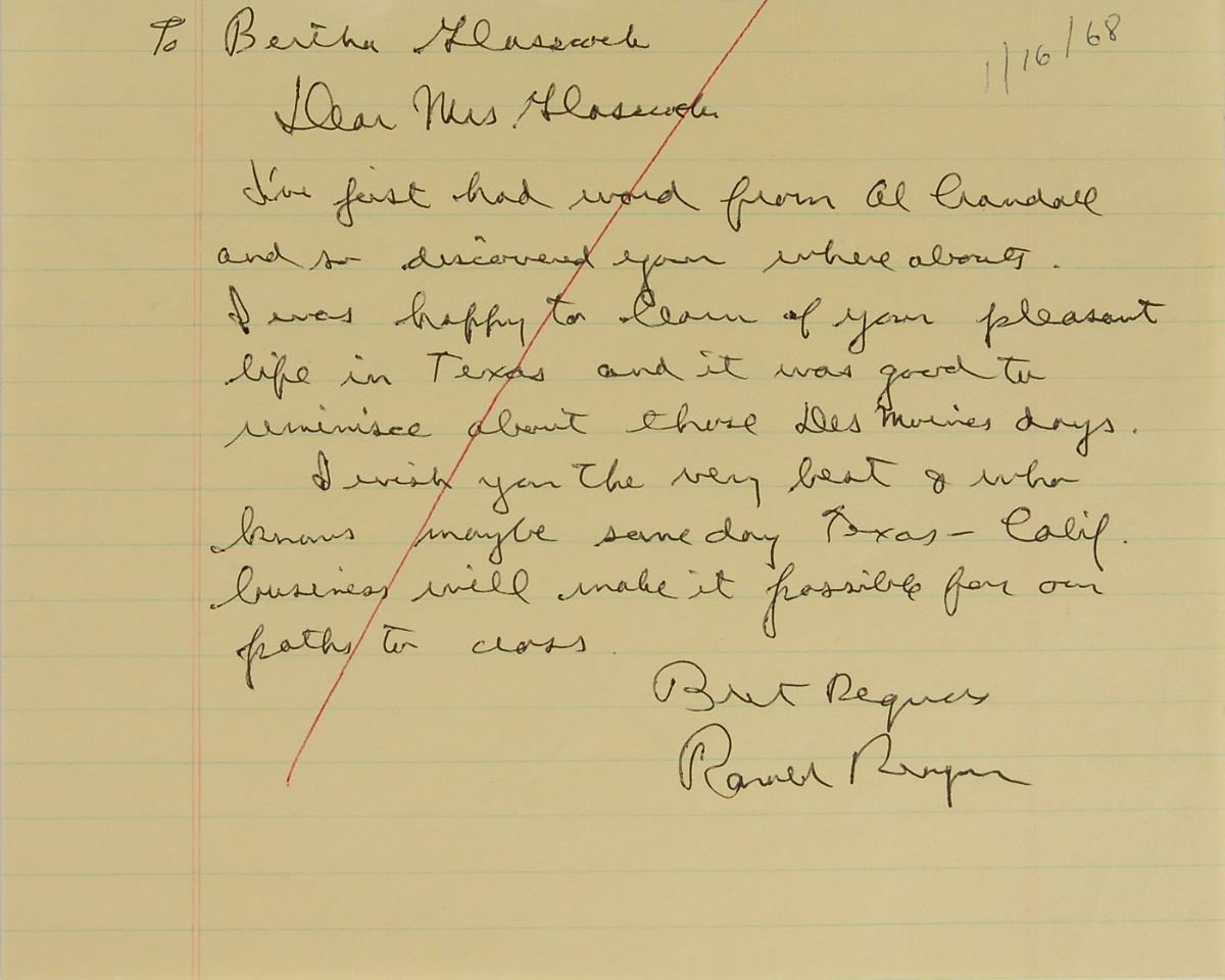 ALS, one page, lightly-lined, 8 x 6.25, January 16, 1968. Draft letter to Bertha Glasscock, in full: “I've just had word from Al Crandall and so discovered your where abouts. I was happy to learn of your pleasant life in Texas and it was good to reminisce about those Des Moines days. I wish you the very best & who knows maybe some day Texas-Calif. business will make it possible for our paths to cross.” Governor Reagan's secretary, Cathy Davis, penned the date above Reagan's letter, as well as drew a diagonal line in red ink across the text, indicating she had typed it for his signature. In fine condition.