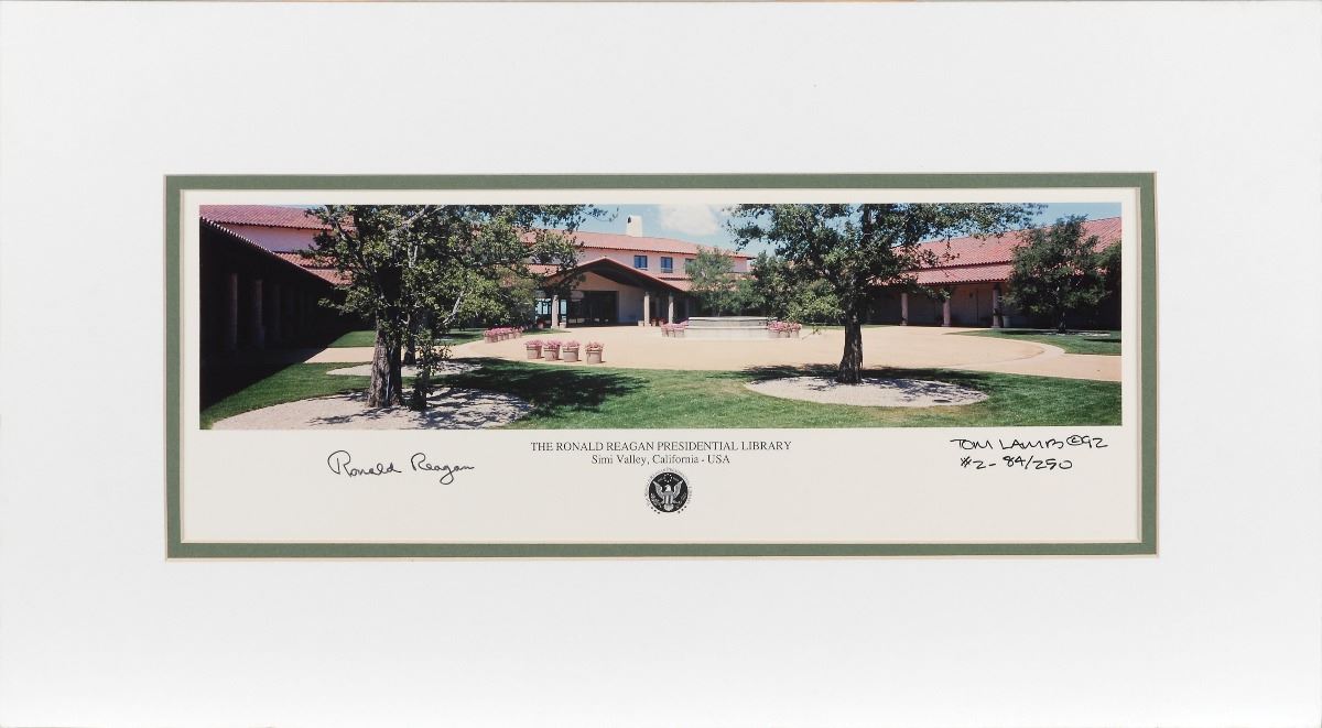 Fantastic limited edition panoramic color glossy 14.5 x 5 photo of the Ronald Reagan Presidential Library in Simi Valley, numbered #2-84/250 [second edition], signed in the lower border in black felt tip by Ronald Reagan and by photographer Tom Lamb. Double-matted and in fine condition.