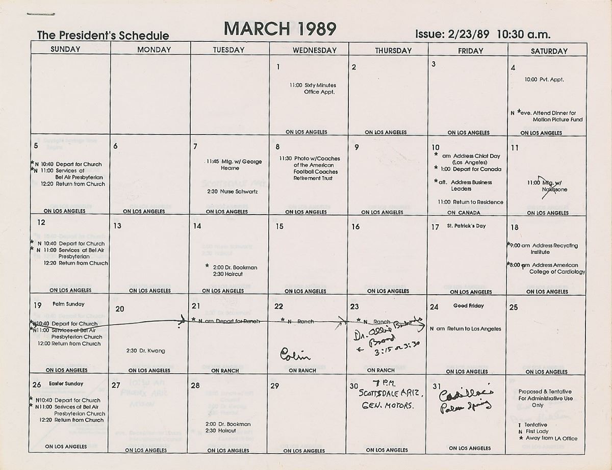 Uncommon unsigned The President’s Schedule calendar for the months of March–May 1989, bearing numerous ink notations in Reagan’s hand, three stapled pages, each 11 x 8.5, issued on February 23, 1989. The March notations include: “Colin,” “& P.M., Scottsdale Ariz. Gen. Motors,” and “Cadillac’s Palm Spring”; and for April: “Scottsdale Ariz. 7 P.M.,” “10:30 AM, Phoenix Ariz, Nisson,” and “Dr. House award dinner.” The reverse of the May sheet bears three sets of math equations by Reagan. In fine condition. An interesting and unique format that offers insight into Reagan’s immediate schedule following his departure from the White House in January of 1989.