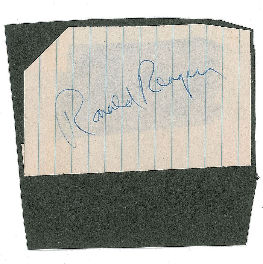 Ballpoint signature, “Ronald Reagan,” on an off-white 3.5 x 2.25 lightly-lined slip affixed to a slightly larger clipped sheet. In very good to fine condition, with adhesive residue on the reverse lightly showing through.