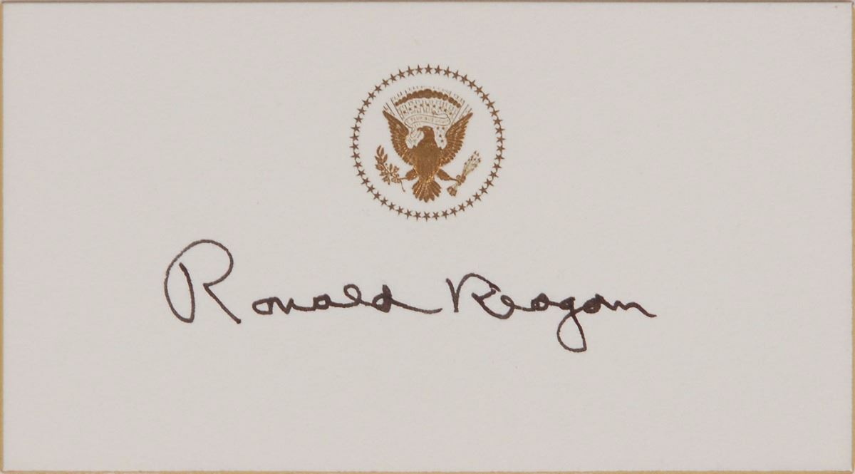 Bright white gilt-edged card embossed with a gold presidential seal, 4 x 2.25, neatly signed in black felt tip by Reagan. In very fine condition. Accompanied by a full letter of authenticity from JSA. Pre-certified PSA/DNA.