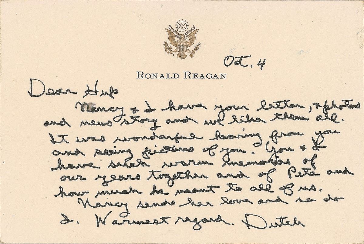 ALS signed “Dutch,” one page, 6.25 x 4.25, personal stationery card bearing an embossed presidential seal, October 4 [1993]. Letter to his longtime friend Lydia ‘Hup’ MacArthur, in full: “Nancy & I have your letter, & photos and news story and we like them all. It was wonderful hearing from you and seeing pictures of you. You & I have such warm memories of our years together and of Pete and how much he meant to all of us. Nancy sends her love and so do I.” In fine condition, with trivial soiling and a spot of spreading to a single word. Lydia Hupfer ‘Hup’ MacArthur was the widow of Pete MacArthur, program director of WOC in Davenport, Iowa. In 1932, MacArthur had given a then 21-year-old Reagan his first job as a sports announcer. They would remain friends until her passing at the age of 102 in 1995.