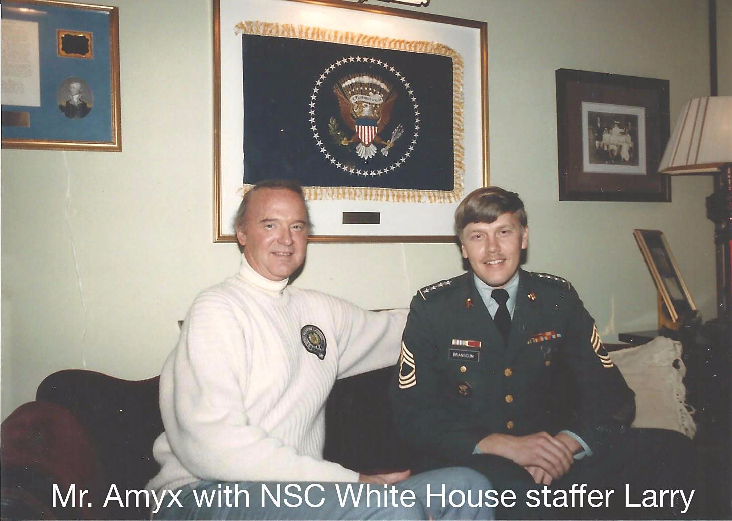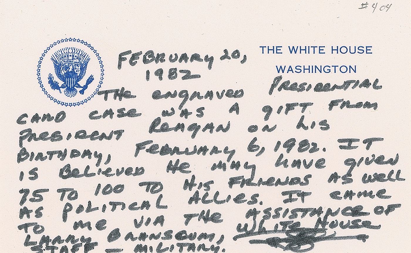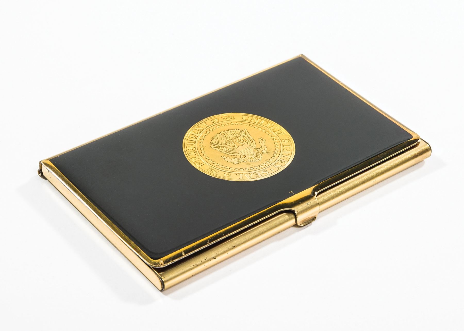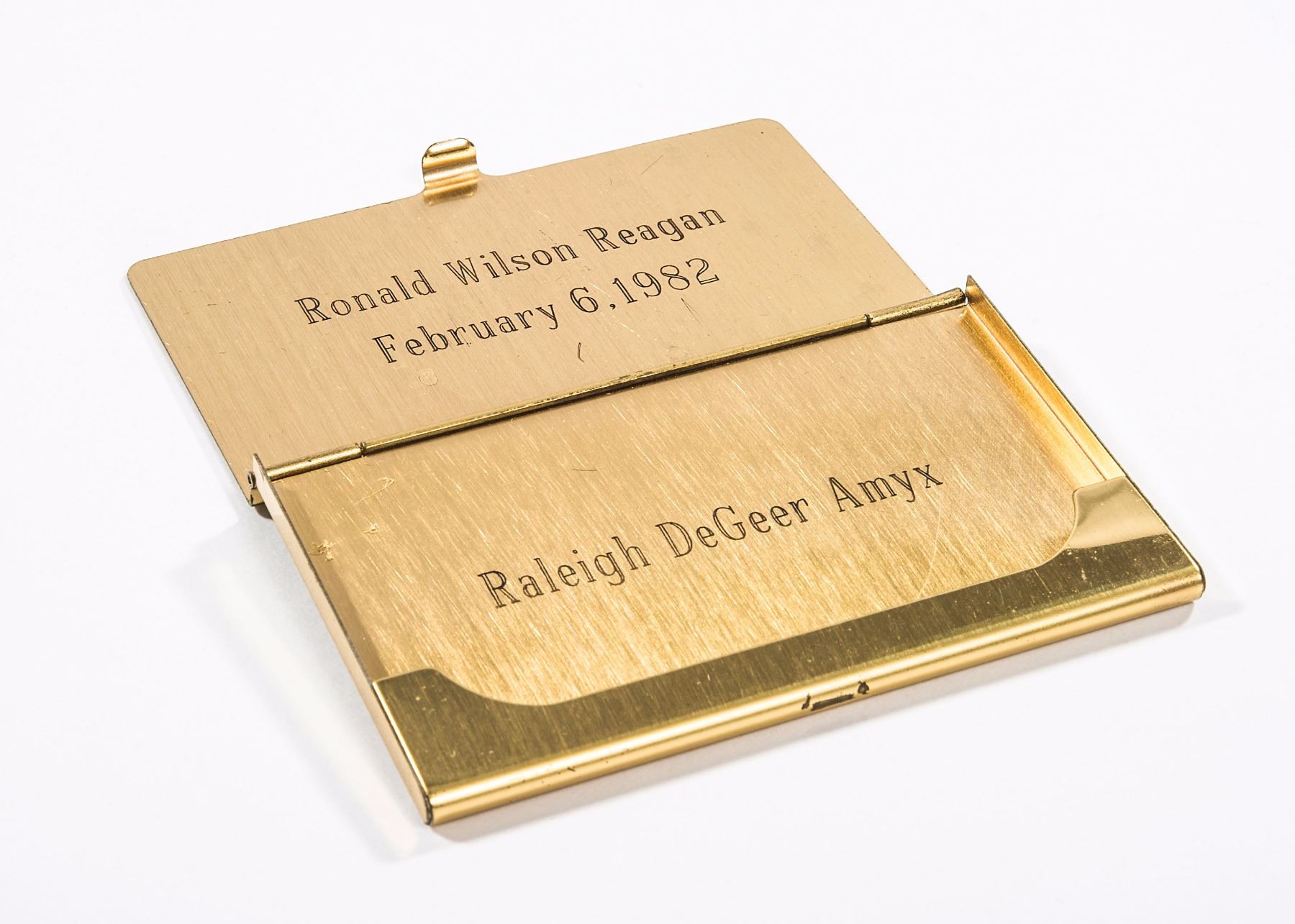 Scarce thin metal card case given as a gift by President Reagan to his associates, 3.5 x 2.25, featuring a gold presidential seal adorning the smooth black cover, engraved inside, "Ronald Wilson Reagan, February 6, 1982" and "Raleigh DeGeer Amyx." Includes a letter of provenance on a White House card from Amyx. In full: "The engraved presidential card case was a gift from President Reagan on his birthday, February 6, 1982. It is believed he may have given 75 to 100 to his friends as well as political allies. It came to me via the assistance of Larry Branscum, White House [NSC] staff-military." Also accompanied by an ideal suede slipcase. From the Raleigh DeGeer Amyx Collection.