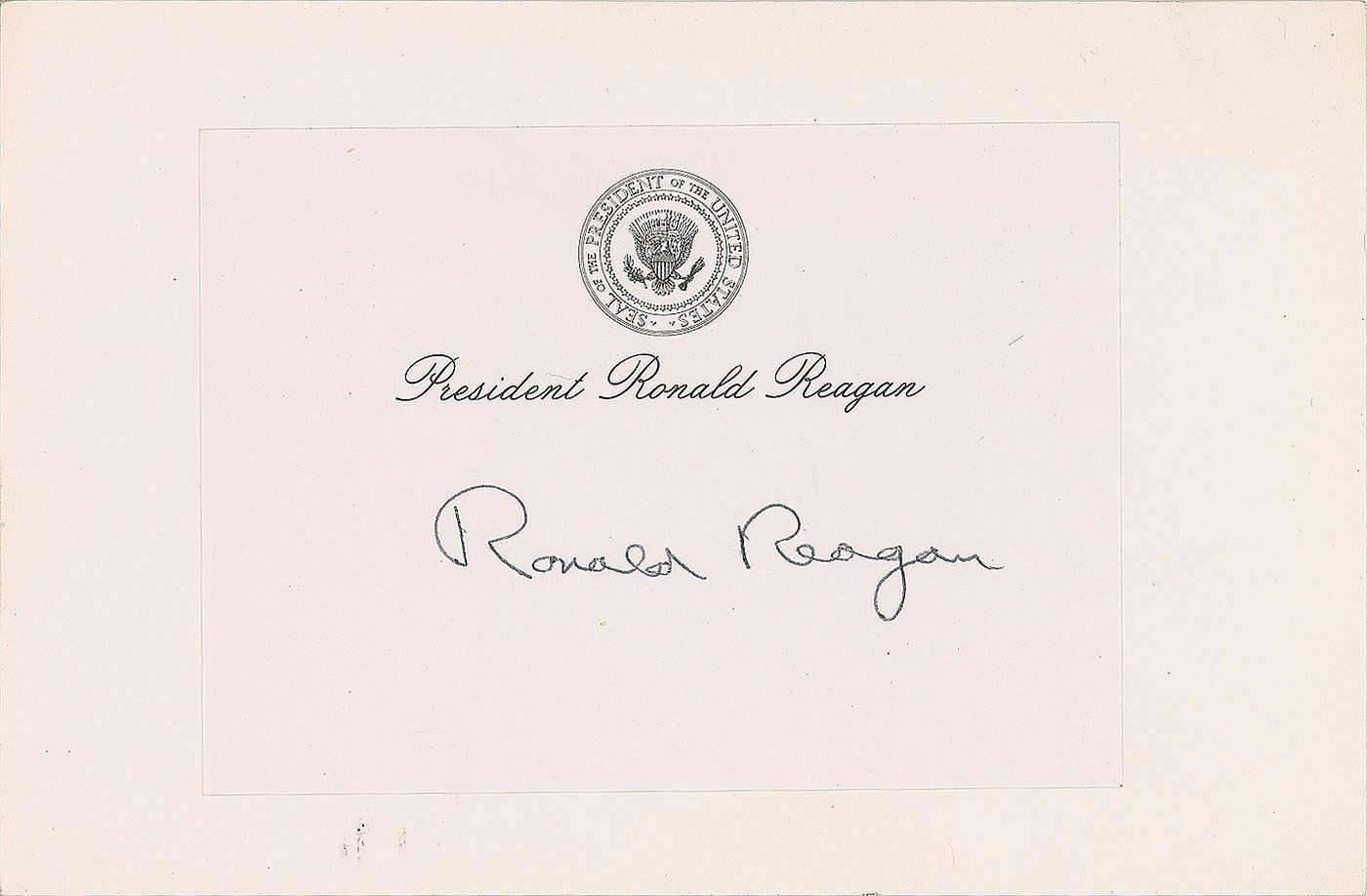 Ballpoint signature, "Ronald Reagan,” on an off-white 4 x 3 presidential slip. Affixed at the top edge to a larger card. In fine condition. From the Harvey and Rhoda Kuflik Collection.
