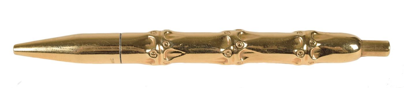 Brilliant 14-karat yellow gold ballpoint pen from the personal collection of Ronald and Nancy Reagan, used by the couple while they resided at their home in Bel Air, California. Made by Tiffany, the pen measures 5? in length and is designed in the style of a bamboo reed, with the nib featuring a “T” hallmark and 14K stamp. In fine condition. Provenance: The Private Collection, President & Mrs. Ronald Reagan, Christie's, September 2016. In fine condition.