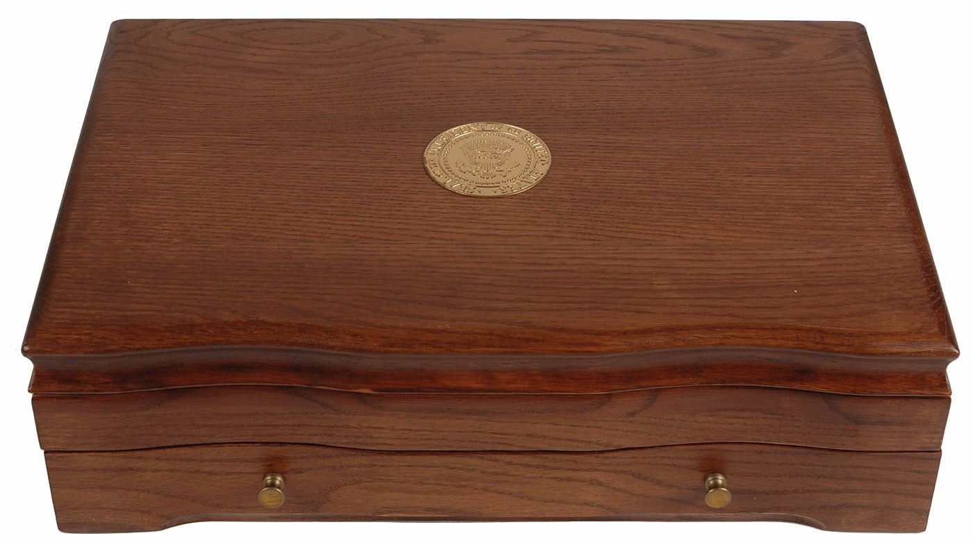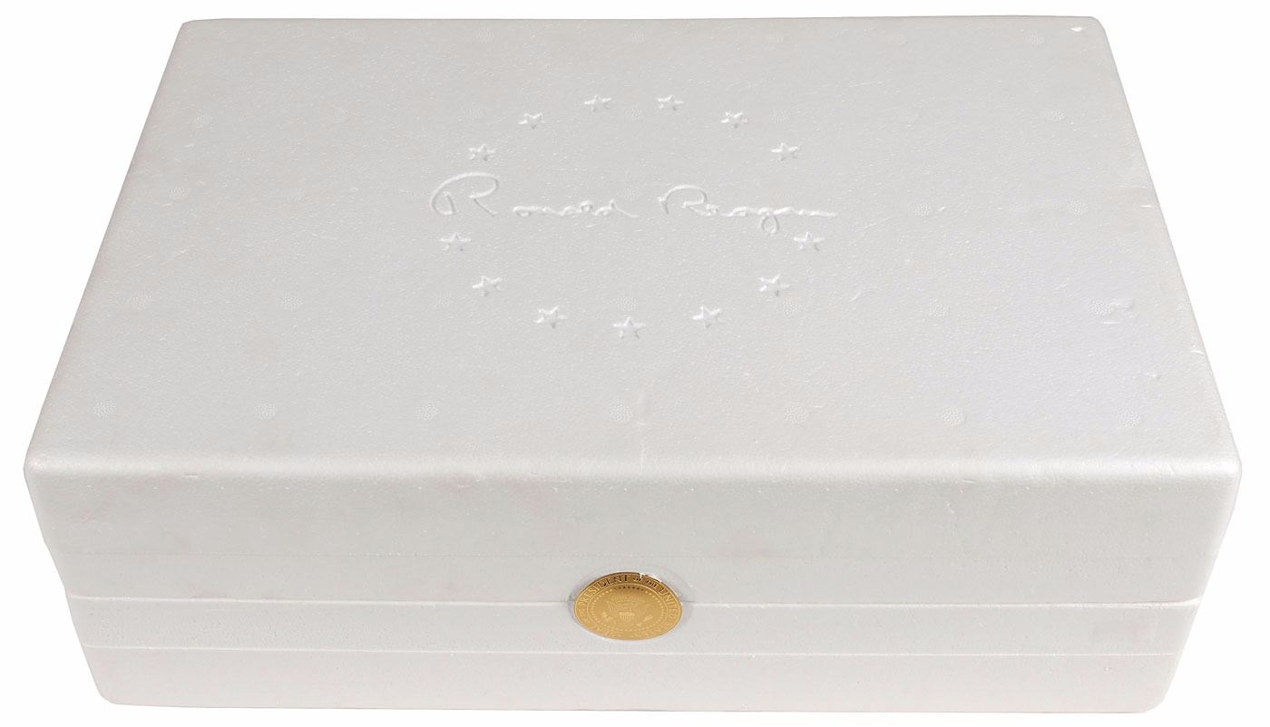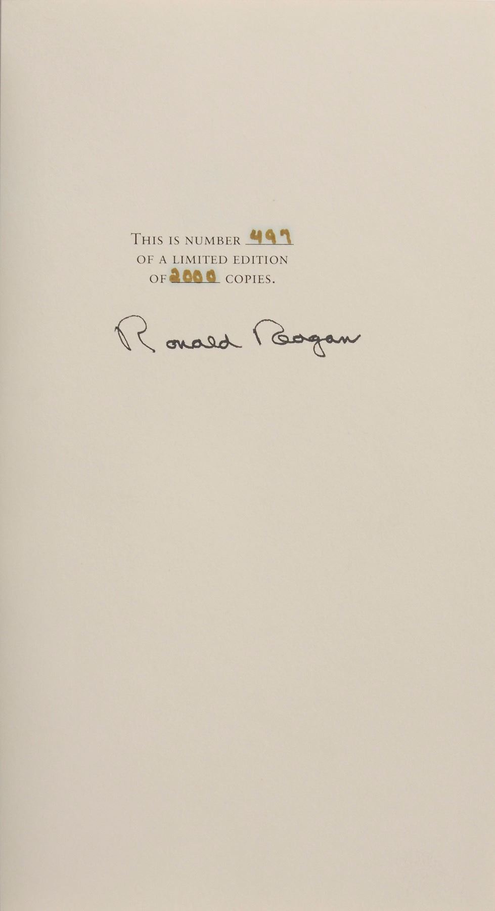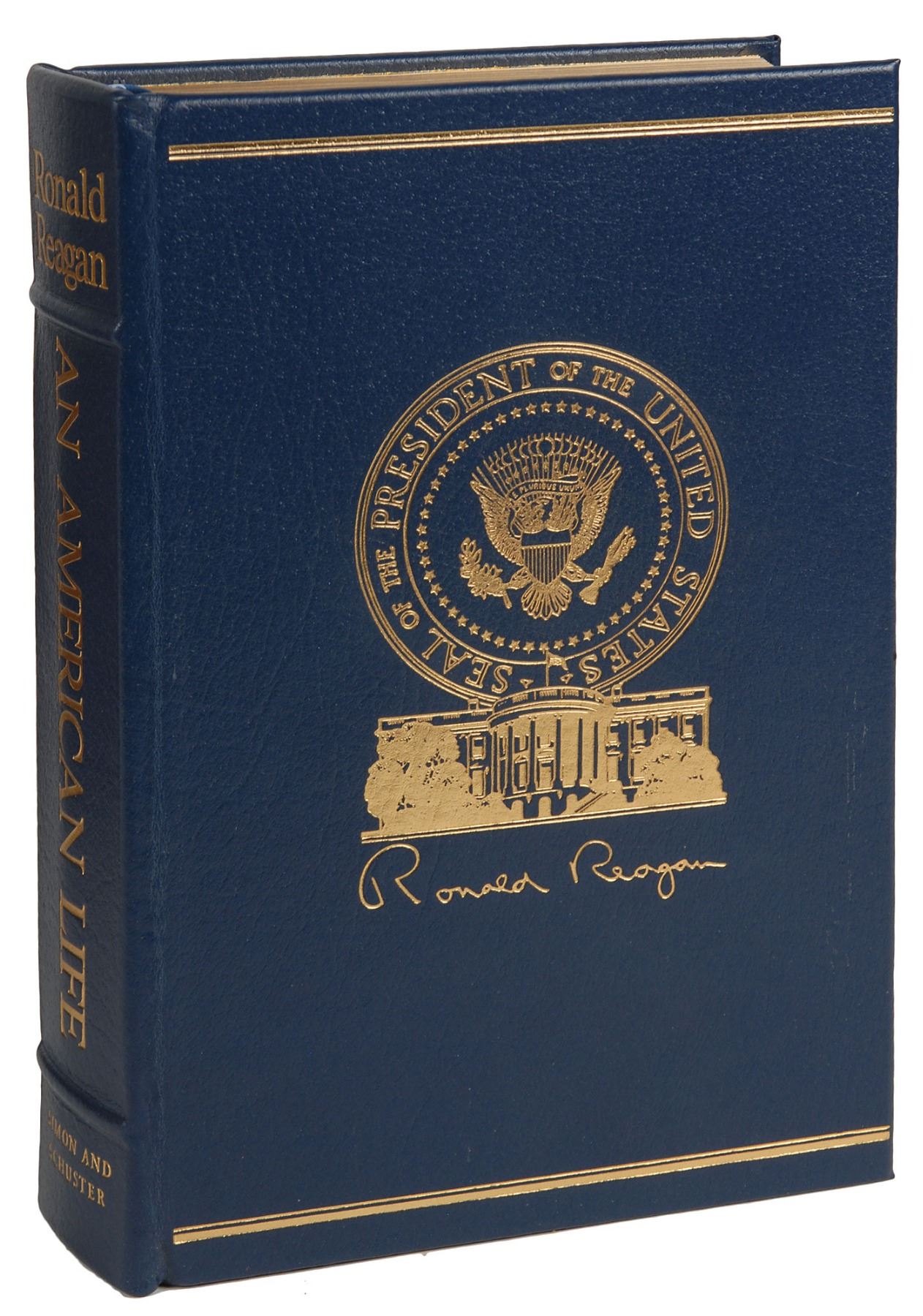 Signed book: An American Life. Deluxe limited first edition, numbered 497/2000. NY: Simon & Schuster, 1990. Leather-bound hardcover, 6.5 x 9.5, 748 pages. Signed on the colophon in black ink by Reagan. Housed in its original publisher’s oak presentation case with brass handles; a separate drawer contains a six-cassette audio version of Reagan’s Speaking My Mind. Includes the rare original Styrofoam box with impressed Reagan signature and gold seal. In very fine condition.