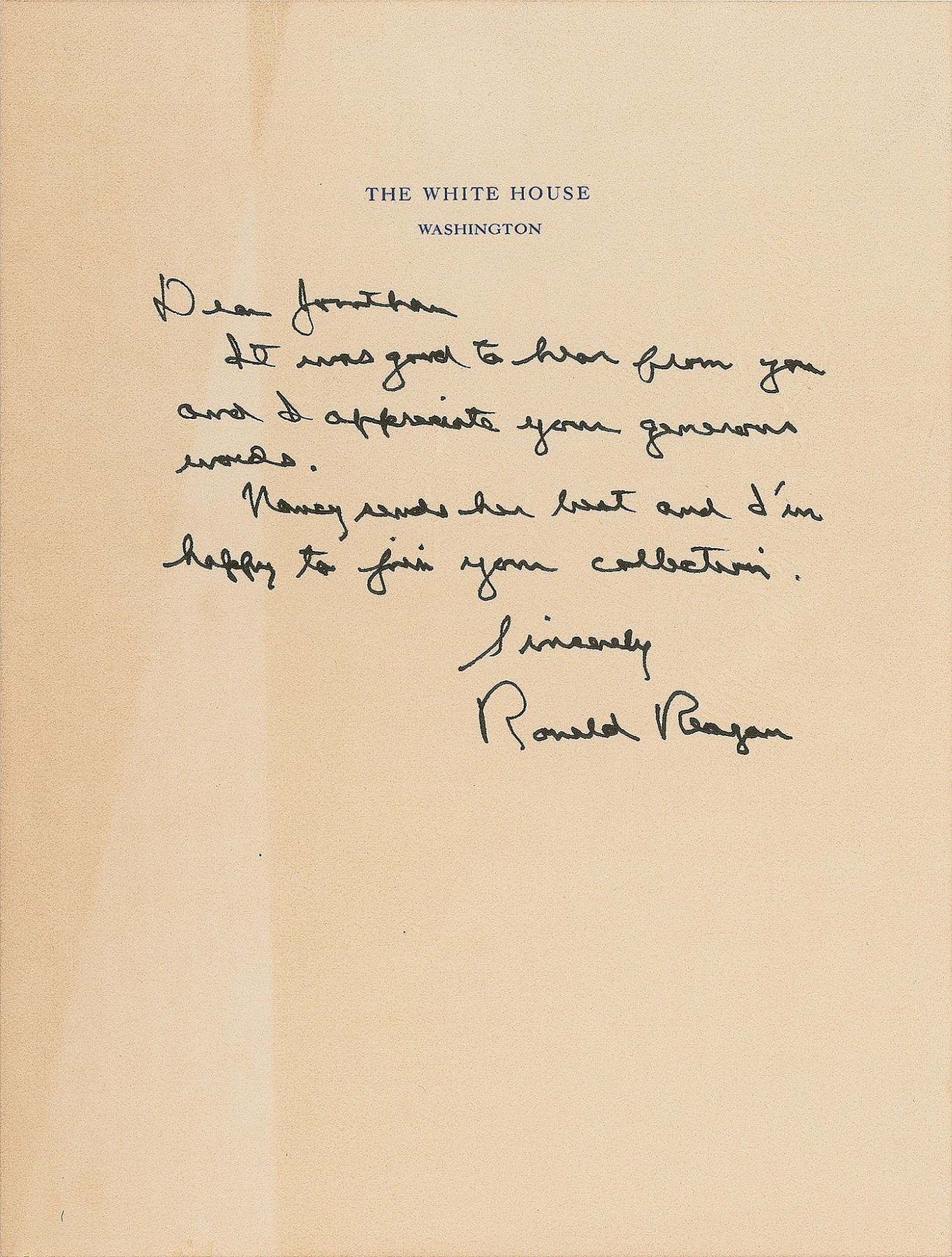 ALS as president, one page, 6.75 x 9, White House letterhead, no date. Letter to actor Jonathan Winters, in full: "It was good to hear from you and I appreciate your generous words. Nancy sends her best and I'm happy to join your collection." In fine condition, with light irregular toning. Accompanied by a certificate of authenticity from Profiles in History affirming that the letter was obtained "directly from Jonathan Winters, to whom the letter was addressed." Years before reaching the White House, California Governor Ronald Reagan appeared on The Dean Martin Show on September 13, 1973. As the celebrity guest of honor, Reagan was roasted by a series of personalities that included Jackie Vernon, Phyllis Diller, Dom DeLuise, Jack Benny, Don Rickles, and Nancy Reagan. Also among the lineup was Jonathan Winters, who proceeded to dress up as Miss Maude Frickert, the purported first-grade elementary teacher of Reagan, and a character he played frequently throughout his career. Over the course of the three-minute roast, Winters poked fun at Reagan for everything from his suspiciously youthful hair color to his decision to go to college in Eureka, Illinois.