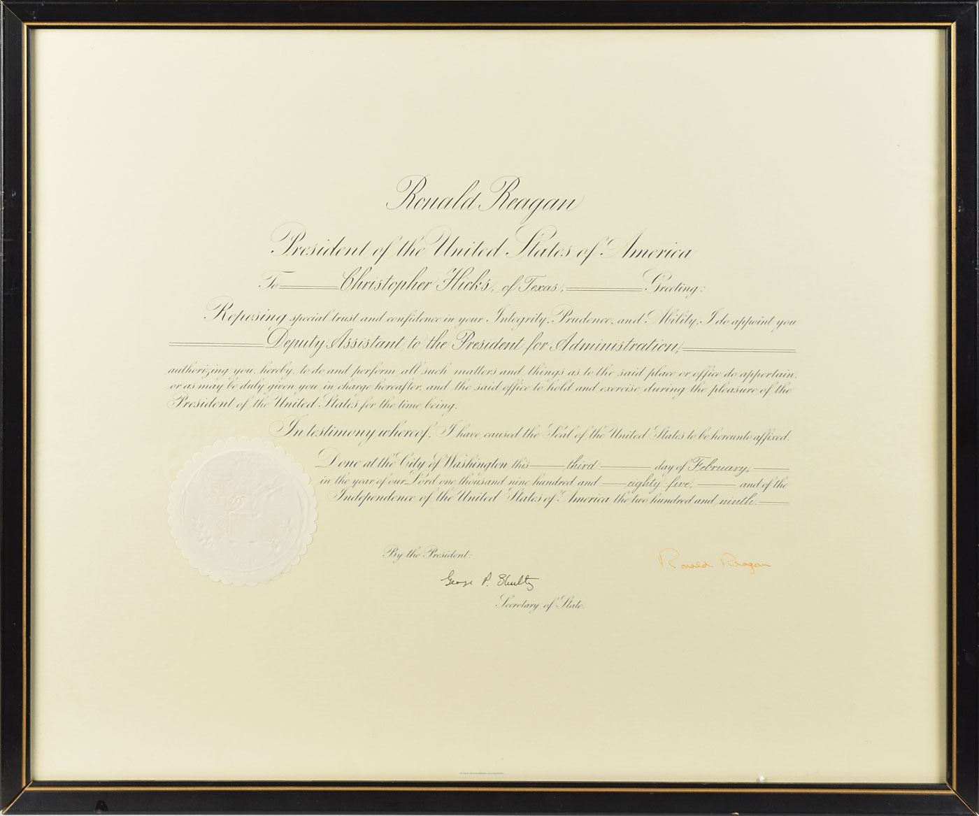 Rare partly-printed DS as president, one page, 22.5 x 18.5, February 3, 1985. President Reagan appoints Christopher Hicks of Texas as "Deputy Assistant to the President for Administration." Signed at the conclusion by President Reagan; also signed by autopen for Secretary of State George P. Shultz. The white paper seal affixed to the lower left remains fully intact. Framed and in fine condition, with the signature faded but fully legible, and light bubbling in areas, as the document appears to be mounted. Accompanied by a full letter of authenticity from JSA. Reagan is excessively rare in signed presidential appointments, with this example dating to shortly after his second term began.