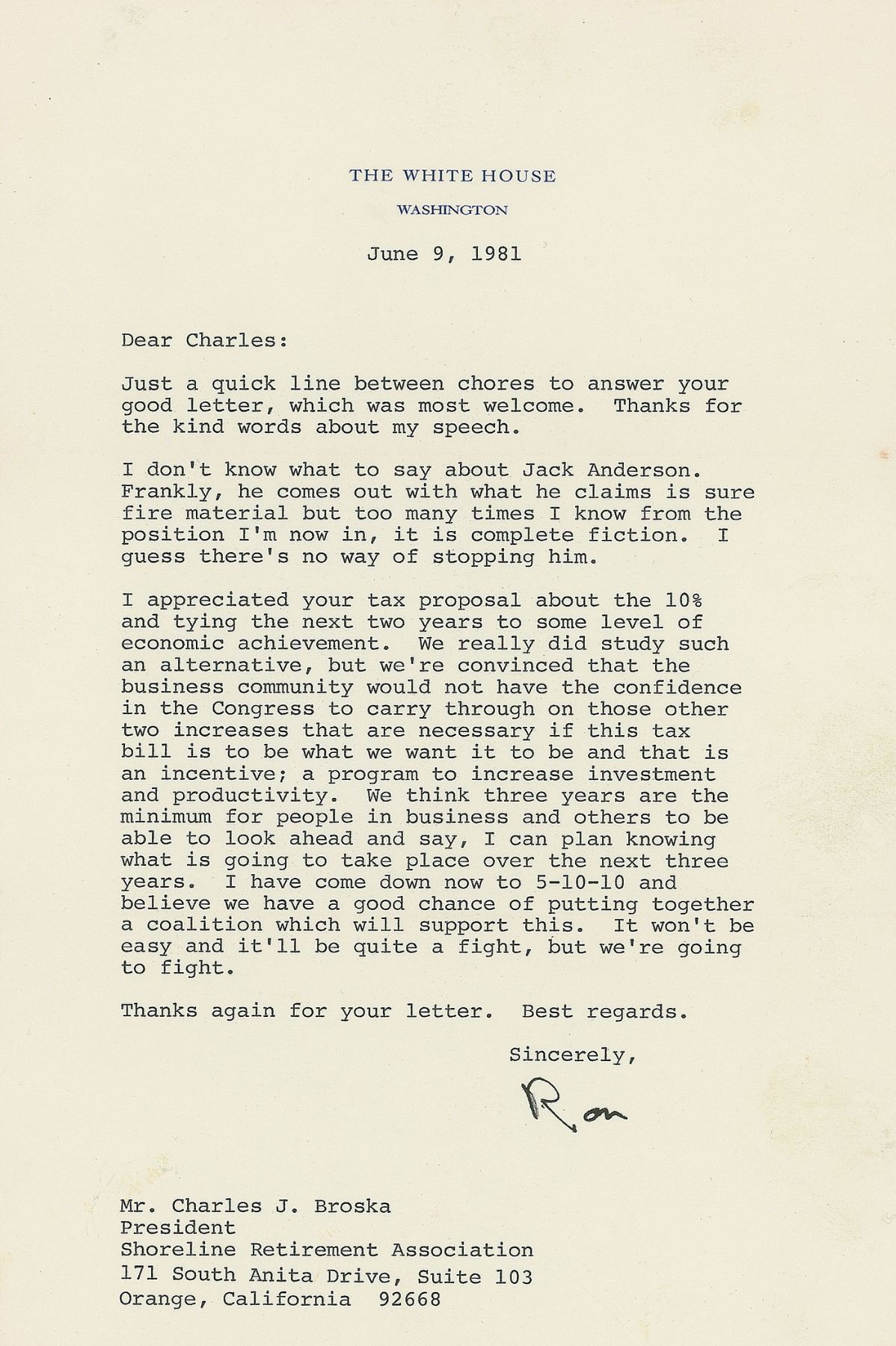 TLS as president signed “Ron,” one page, 7 x 10.5, White House letterhead, June 9, 1981. Letter to Charles J. Broska of the Shoreline Retirement Association, in part: “I don’t know what to say about Jack Anderson. Frankly, he comes out with what he claims is sure fire material but too many times I know from the position I’m now in, it is complete fiction. I guess there’s no way of stopping him. I appreciated your tax proposal about the 10% and trying the next two years to come to some level of economic achievement. We really did study such an alternative, but we’re convinced that the business community would not have the confidence in the Congress to carry through on those other two increases that are necessary if this tax bill is to be what we want it to be and that is an incentive; a program to increase investment and productivity.” In fine condition. Jack Anderson was an investigative reporter who became the scourge of the Reagan administration five years later when he broke the Iran–Contra story.