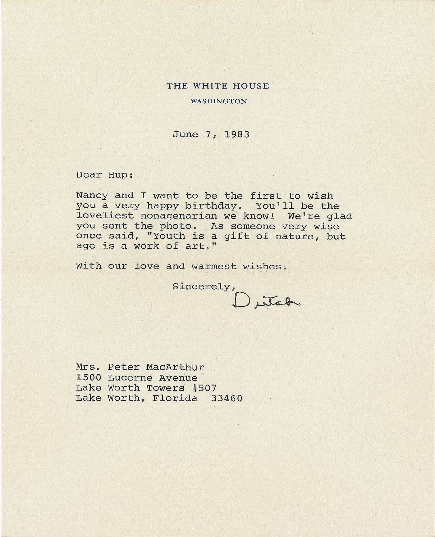 TLS as president signed “Dutch,” one page, 6.75 x 8.75, White House letterhead, June 7, 1983. Letter to his longtime friend Lydia ‘Hup’ MacArthur, in full: "Nancy and I want to be the first to wish you a very happy birthday. You'll be the loveliest nonagenarian we know! We're glad you sent the photo. As someone very wise once said, 'Youth is a gift of nature, but age is a work of art.' With our love and warmest wishes." In fine condition. Accompanied by the original White House mailing envelope. Lydia Hupfer ‘Hup’ MacArthur was the widow of Pete MacArthur, program director of WOC in Davenport, Iowa. In 1932, MacArthur had given a then 21-year-old Reagan his first job as a sports announcer. They would remain friends until her passing at the age of 102 in 1995.