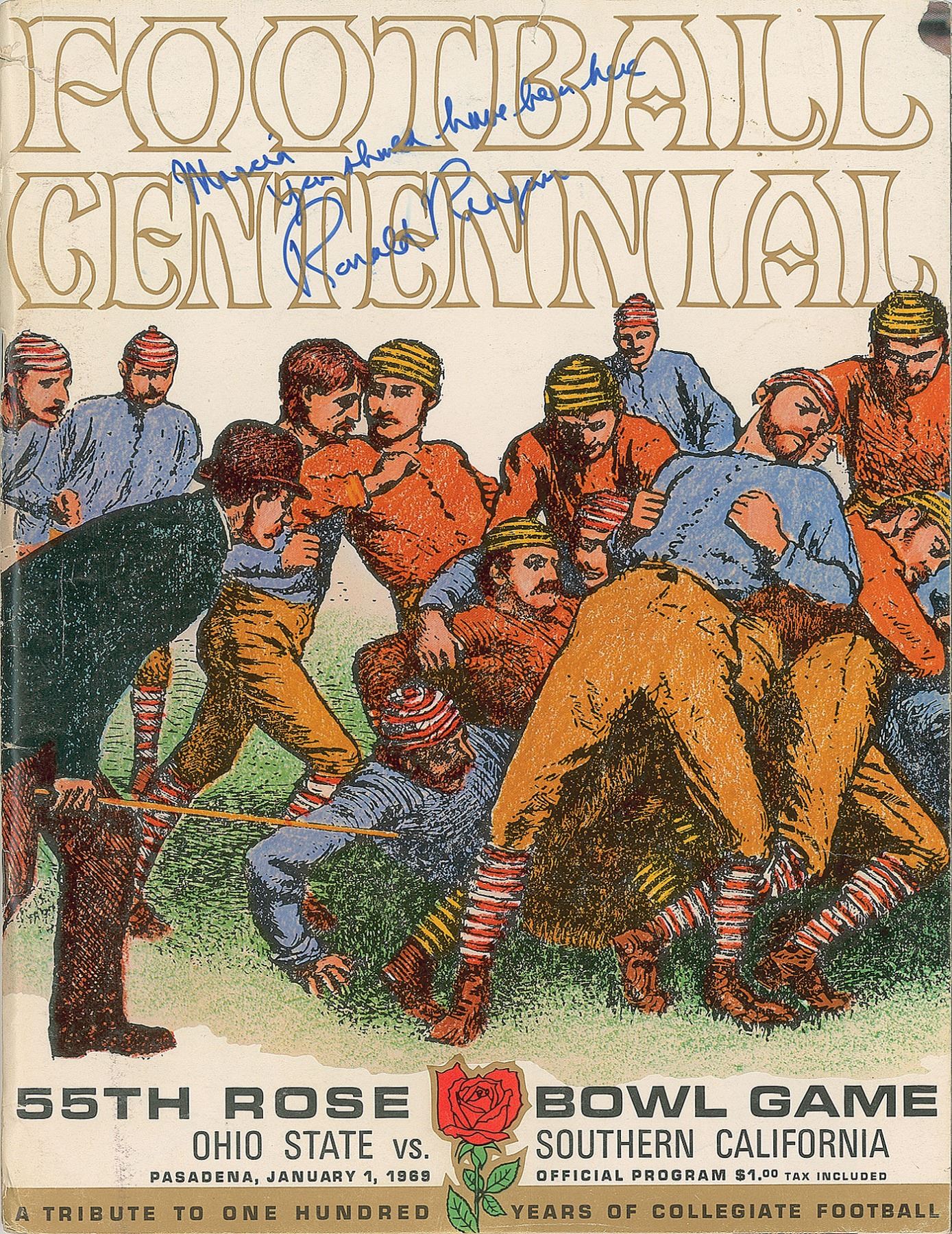 Official program for the 55th Rose Bowl Game held in Pasadena, California, on January 1, 1969, ninety-six pages, 8.5 x 11, signed and inscribed on the front cover in blue felt tip, "Marcia, You should have been here, Ronald Reagan." In very good to fine condition, with handling wear, two short tears to the top, and paper loss to the upper right corner tip.