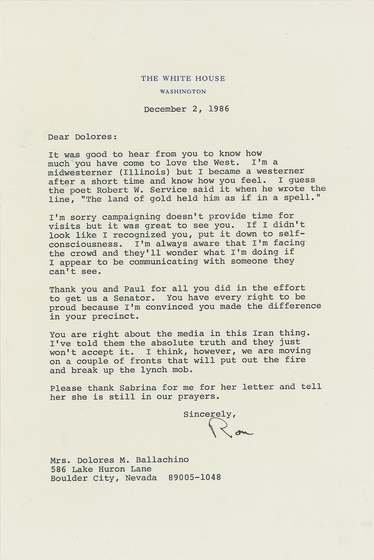 TLS as president signed “Ron,” one page, 7 x 10.5, White House letterhead, December 2, 1986. Letter to Dolores M. Ballachino in Boulder City, Nevada. In part: "It was good to hear from you to know how much you have come to love the West. I'm a midwesterner (Illinois) but I became a westerner after a short time and know how you feel. I guess the poet Robert W. Service said it when he wrote the line, 'The land of gold held him as if in a spell.' I'm sorry campaigning doesn't provide time for visits but it was great to see you. If I didn't look like I recognized you, put it down to self-consciousness. I'm always aware that I'm facing the crowd and they'll wonder what I'm doing if I appear to be communicating with someone they can't see. Thank you and Paul for all you did in the effort to get us a Senator. You have every right to be proud because I'm convinced you made the difference in your precinct. You are right about the media in this Iran thing. I've told them the absolute truth and they just won't accept it. I think, however, we are moving on a couple of fronts that will put out the fire and break up the lynch mob." In fine condition. A fascinating letter in which Reagan evokes the great Western plains, the stagecraft involved in politics, and the notorious Iran-Contra scandal.