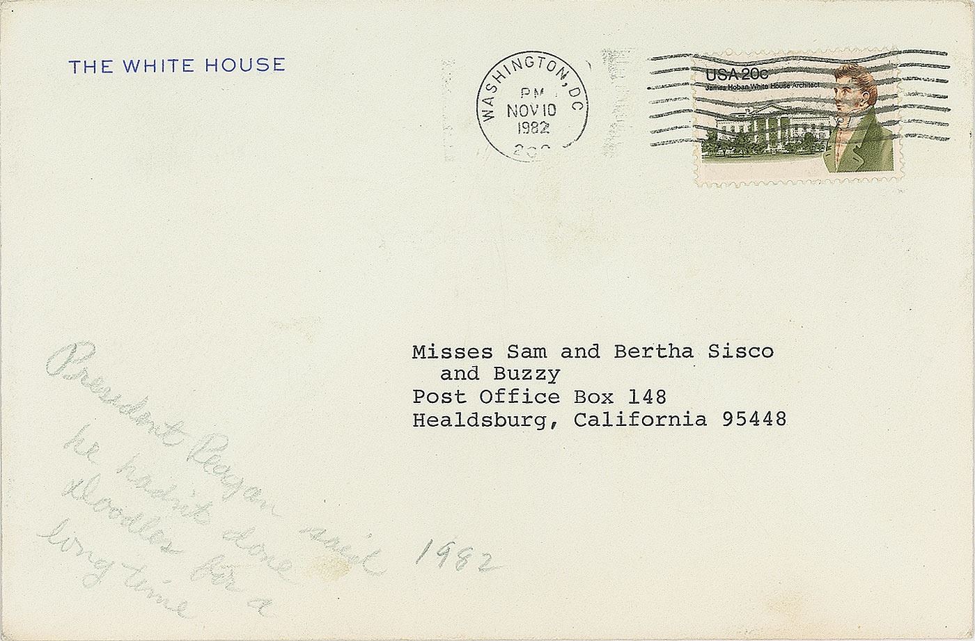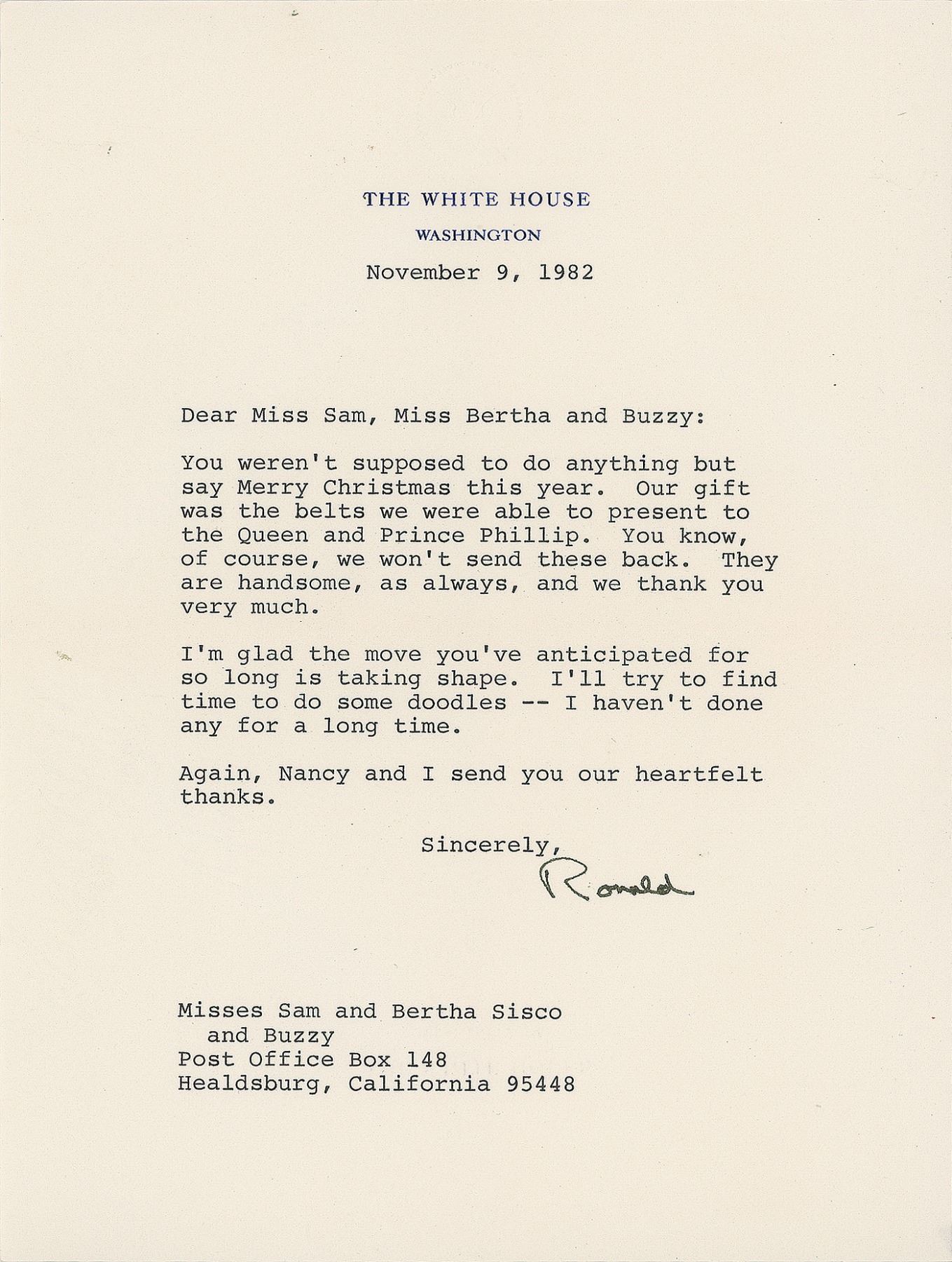 TLS as president, signed “Ronald,” one page, 6.75 x 8.75, White House letterhead, November 9, 1982. Reagan writes to the Sisco family in Healdsburg, California. In part: “You weren’t supposed to do anything but say Merry Christmas this year. Our gift was the belts we were able to present to the Queen and Prince Phillip…I’ll try to find time to do some doodles—I haven’t done any for a long time. Again, Nancy and I send you our heartfelt thanks.” In fine condition. Accompanied by the original mailing envelope.