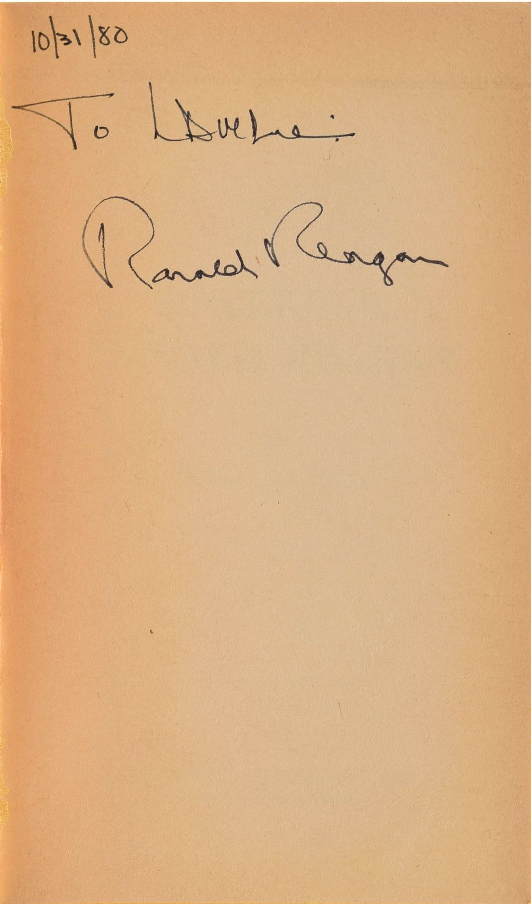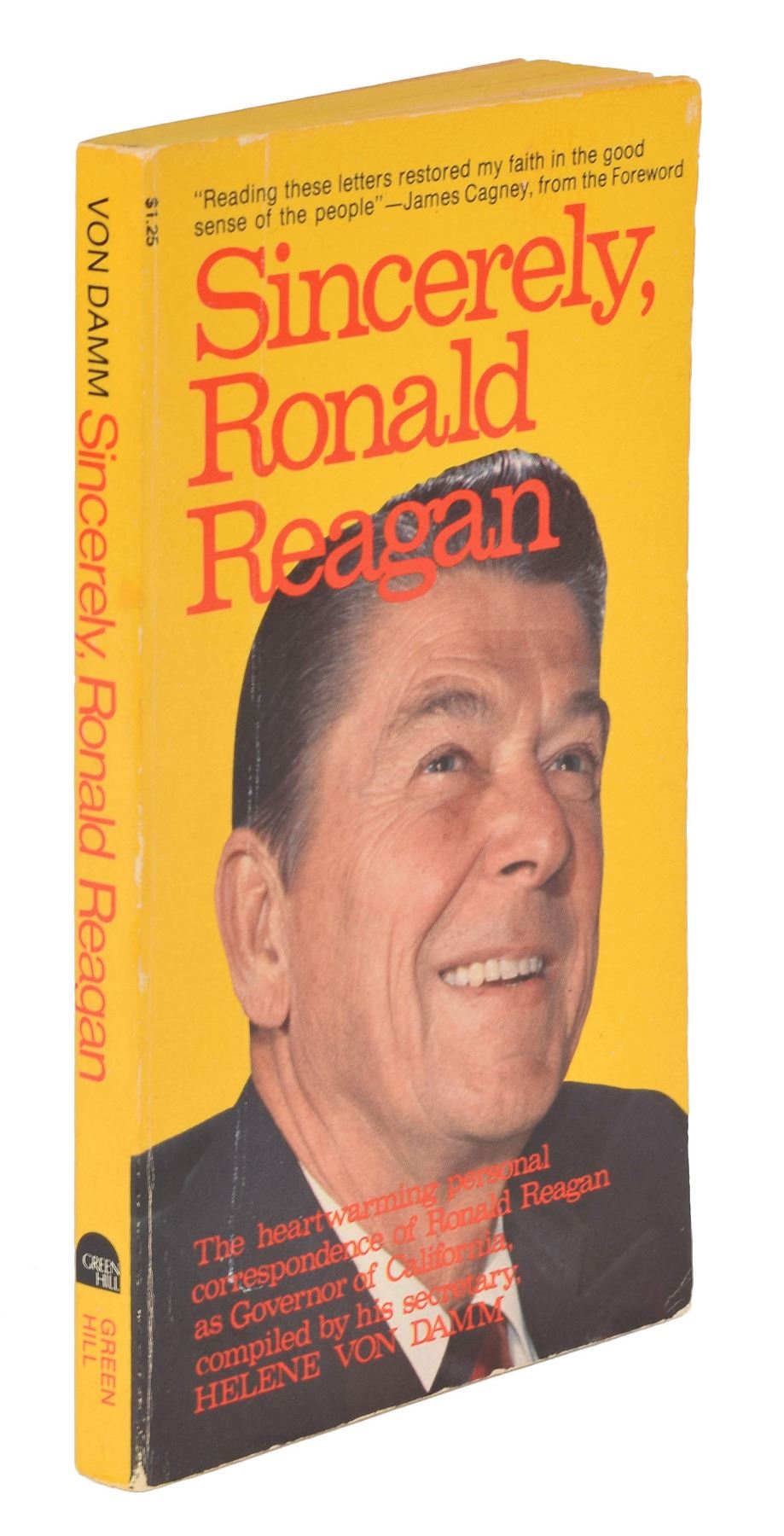 Signed book: Sincerely, Ronald Reagan. Second printing. Ottawa, Illinois: Green Hill Publishers, 1976. Paperback, 4 x 7, 163 pages. Signed on the first free end page in black felt tip, "Ronald Reagan," and inscribed in another hand, "10/31/80, To Laverne." In fine condition.
