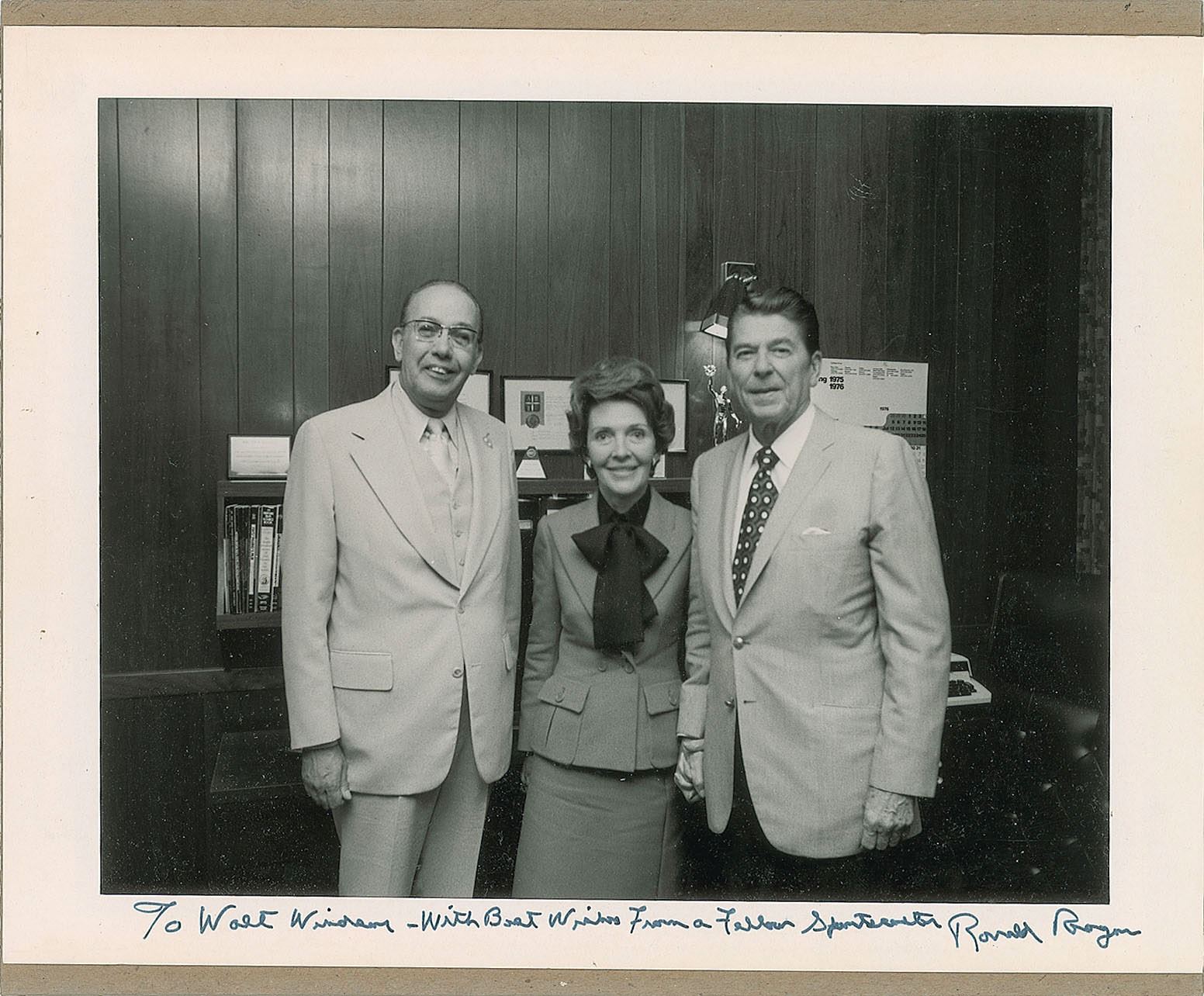 Glossy 9 x 7.25 photo of Ronald and Nancy Reagan posing with a sportscaster, presented in an 11 x 8.5 mat, signed and inscribed on the mat in black felt tip, "To Walt Windam—With Best Wishes From a Fellow Sportscaster, Ronald Reagan.” Affixed to a slightly larger backing and in fine condition. As a young 21-year-old college graduate in 1932, Reagan got his first break as a sportscaster with WOC Radio in Iowa. His talent was quickly recognized, and he moved to WHO in Des Moines where he announced Chicago Cubs baseball games.
