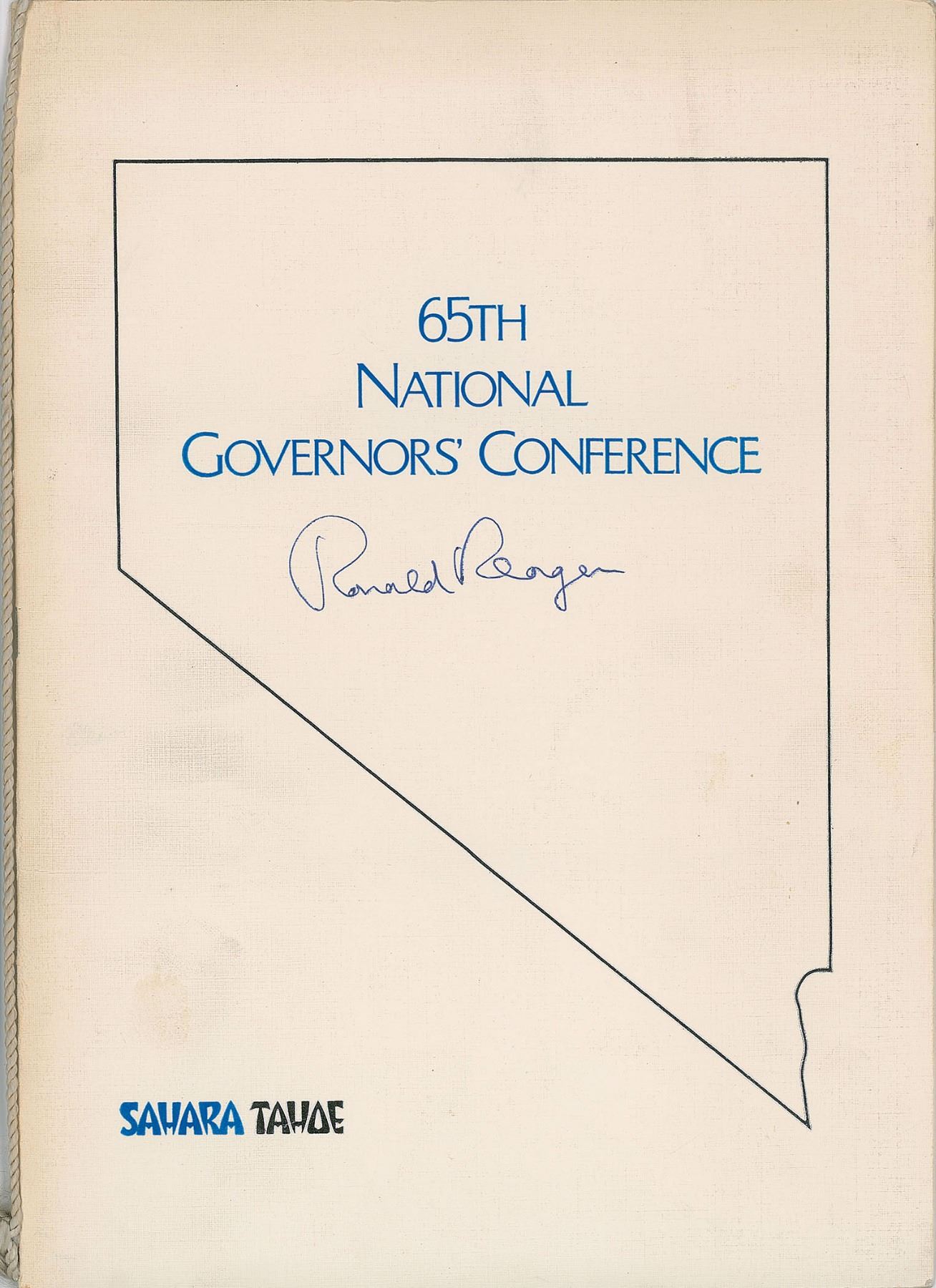 String-bound program for the 65th National Governors' Conference held in Lake Tahoe, Nevada on June 5, 1973, four pages, 8.5 x 12, signed on the front cover in blue ballpoint by Ronald Reagan, then governor of California. In fine condition, with a touch of light soiling.