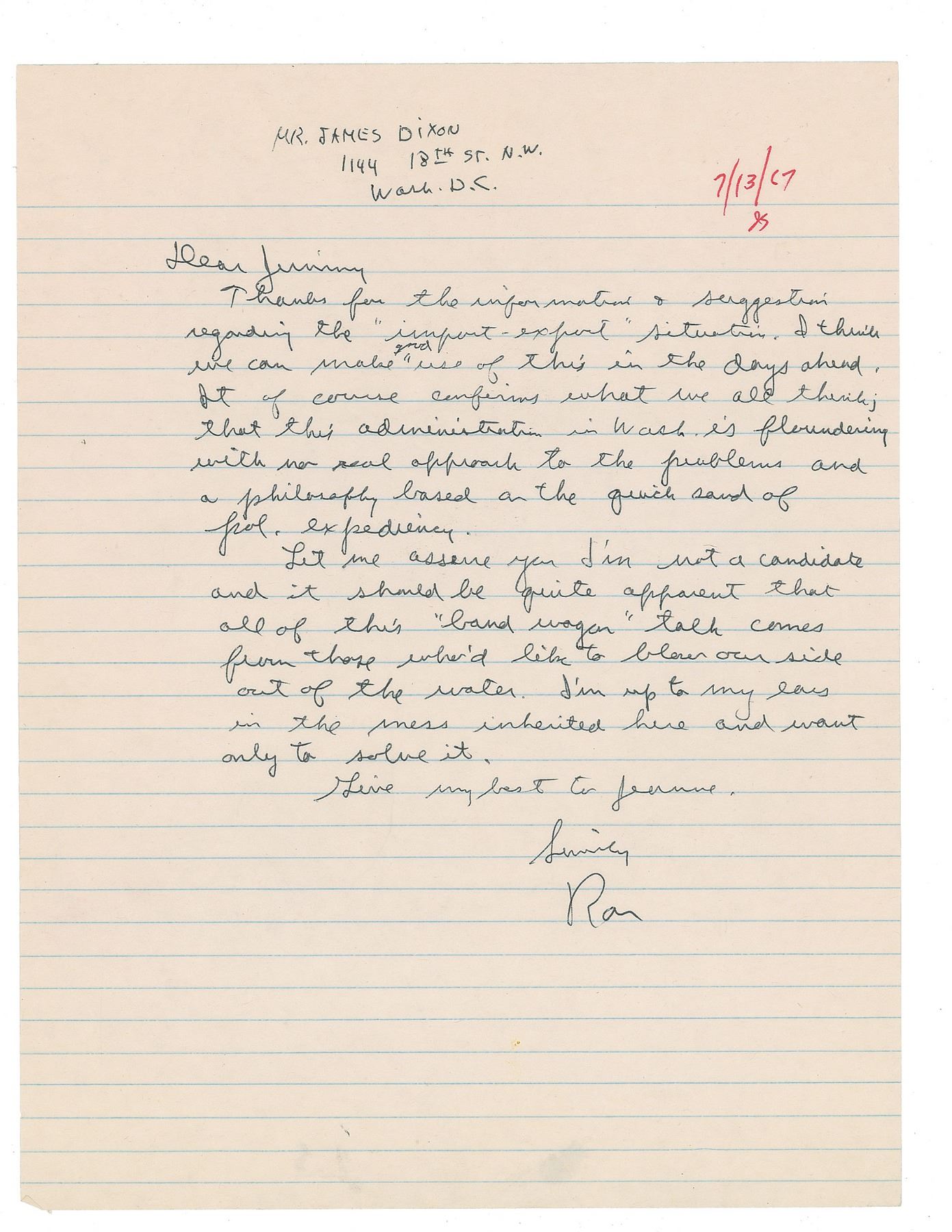 ALS signed “Ron,” one page, 8.5 x 11, [annotated July 13, 1967]. Letter to Jimmy Dixon, in part: "Thanks for the information & suggestions regarding the 'import–export' situation. I think we can make good use of this in the days ahead. It of course confirms what we all think; that this administration in Wash. is floundering with no real approach to the problems and a philosophy based on the quicksand of pol. expediency. Let me assure you I'm not a candidate and it should be quite apparent that all of this 'bad wagon' talk comes from those who'd like to blow our side out of the water. I'm up to my ears in the mess inherited here and want only to solve it." In fine condition.