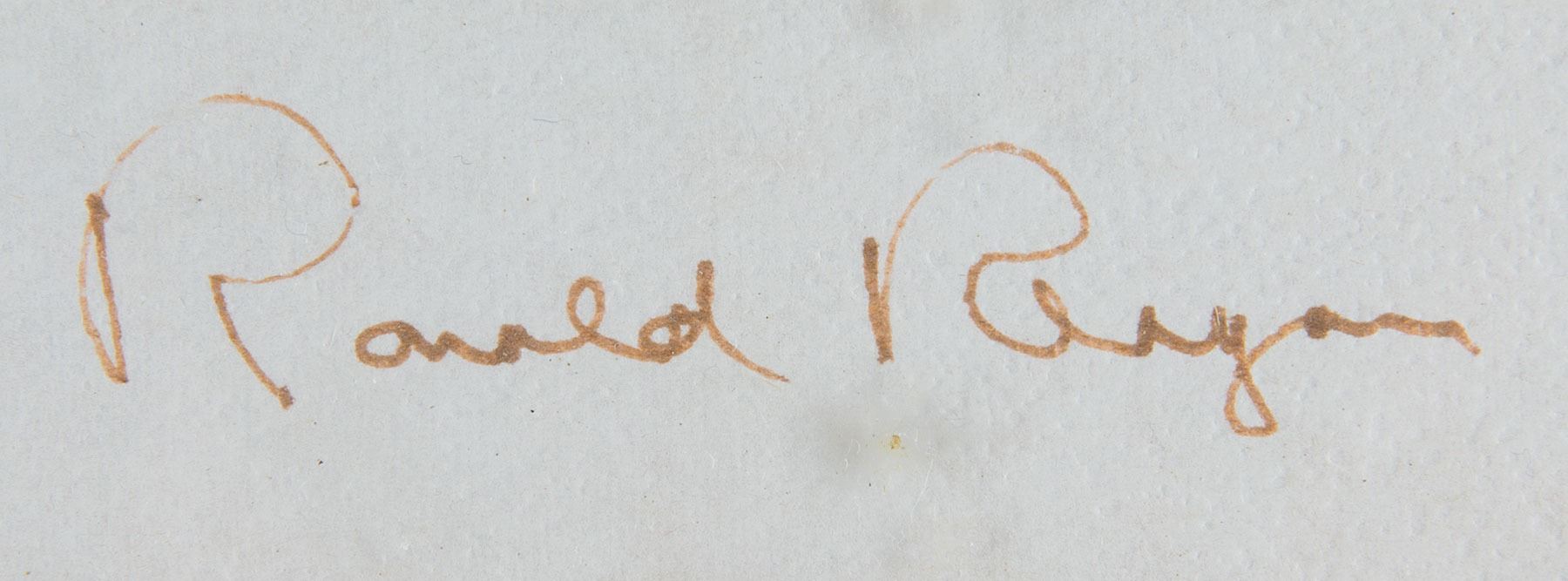 Impressive color semi-glossy 16 x 20 photo of President Reagan's 1984 inauguration, calligraphically inscribed on the mat, "To George White, With best wishes," and signed in black ink, "& Regards, Ronald Reagan." Framed to an overall size of 20.5 x 24.5. In fine condition, with light toning to the mount, and the signature a few shades light. George M. White was an American architect who served as the Architect of the Capitol from January 27, 1971 to November 21, 1995. He oversaw the construction of the Library of Congress James Madison Memorial Building and the Hart Senate Office Building, as well as the restoration of the old Supreme Court and Senate chambers.