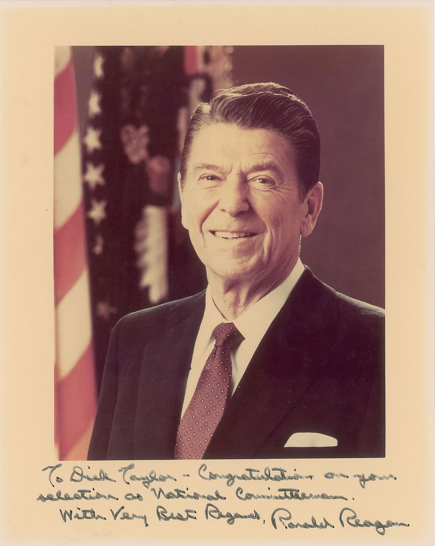 Color satin-finish 8 x 10 photo of President Reagan with an American flag in the background, signed and inscribed in the lower border in black felt tip, "To Dick Taylor—Congratulations on your selection as National Committeeman. With Very Best Regards, Ronald Reagan.” In very good to fine condition, with a few small surface creases, and light overall toning from prior display. Richard Taylor was Republican National Committeeman for Maryland during Reagan’s presidency.