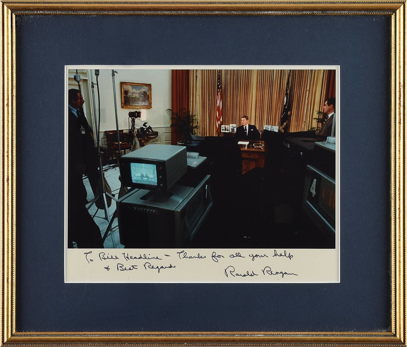 Color satin-finish 9.75 x 7.75 photo of President Reagan seated in the Oval Office during a television broadcast, signed and inscribed in the lower border in black felt tip, "To Bill Headline—Thanks for all your help & Best Regards, Ronald Reagan.” Matted and framed to an overall size of 14.5 x 12.5. In fine condition.
