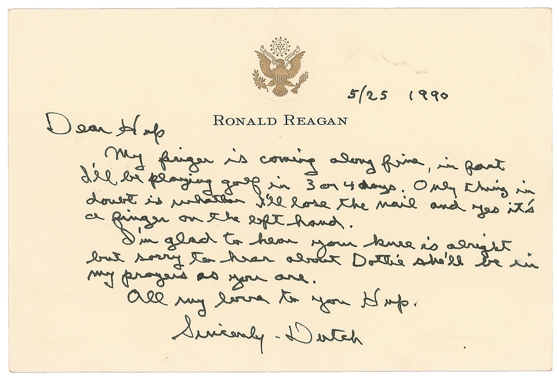 ALS signed “Dutch,” one page, 6.25 x 4.25, personal letterhead, May 25, 1990. Letter to his longtime friend "Hup," Lydia Hupfer McArthur. In full: "My finger is coming along fine, in fact I'll be playing golf in 3 or 4 days. Only thing in doubt is whether I'll lose the nail and yes it's a finger on the left hand. I'm glad to hear your knee is alright but sorry to hear about Dottie she'll be in my prayers as you are. All my love to you Hup." In very fine condition. Lydia Hupfer 'Hup' MacArthur was the widow of Pete MacArthur, program director of WOC in Davenport, Iowa. In 1932, MacArthur had given a then 21 year-old Reagan his first job as a sports announcer. Accompanied by a full letter of authenticity from PSA/DNA.