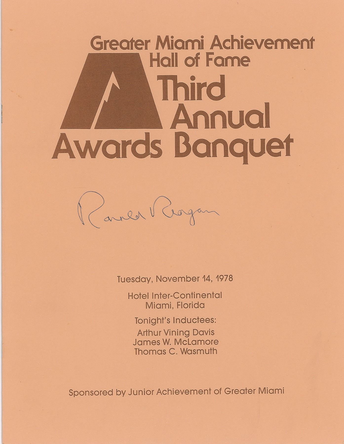Program for the Greater Miami Achievement Hall of Fame Third Annual Awards Banquet held at Miami's Hotel Inter-Continental on November 14, 1978, eight pages, 8.5 x 11, signed on the front cover in black ballpoint by Ronald Reagan. Includes three glossy photos taken of Reagan at the event. In fine condition, with some light handling wear.