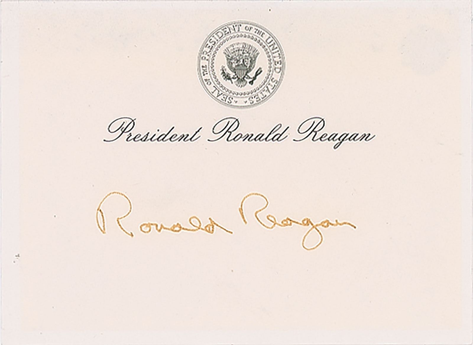 Ink signature, "Ronald Reagan,” on off-white 4 x 3 presidential post-it stationery. In very good to fine condition, with a faint block of toning, and fading to the signature, from prior display.